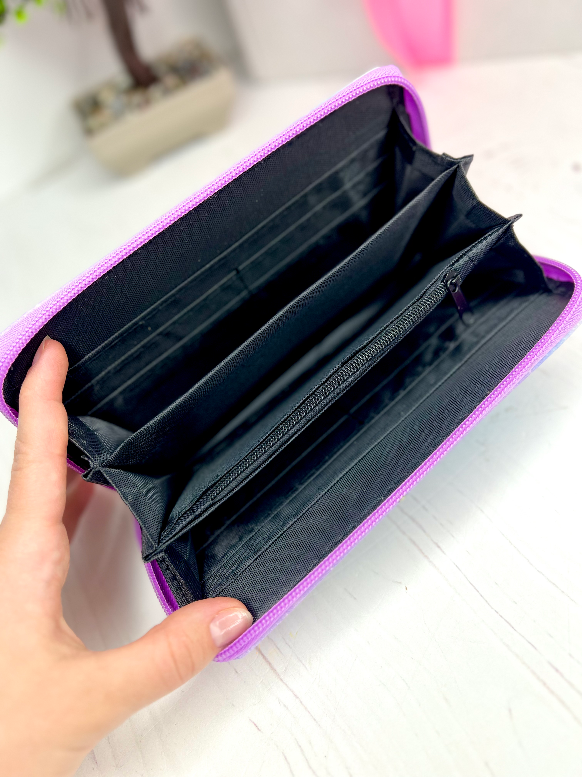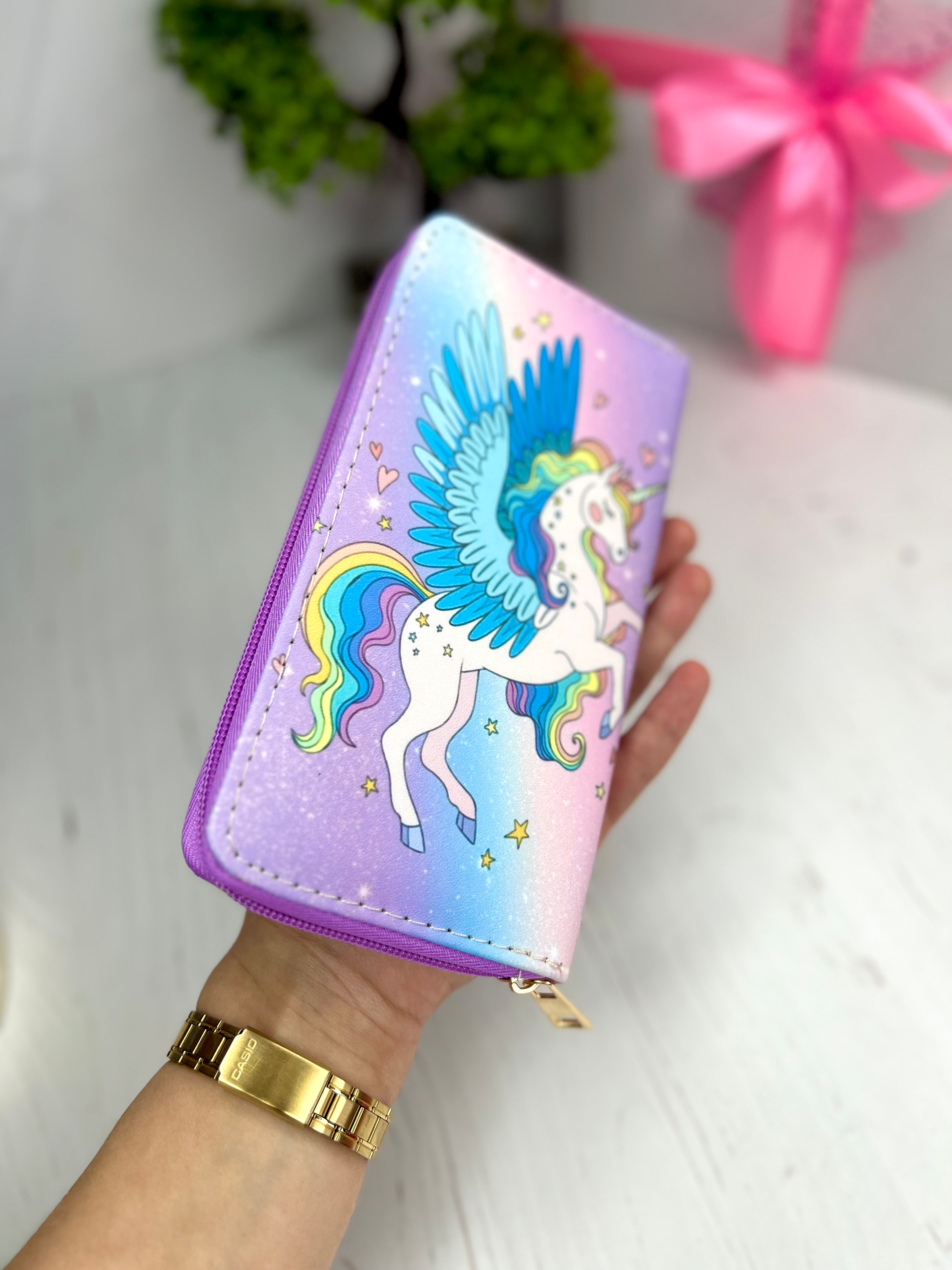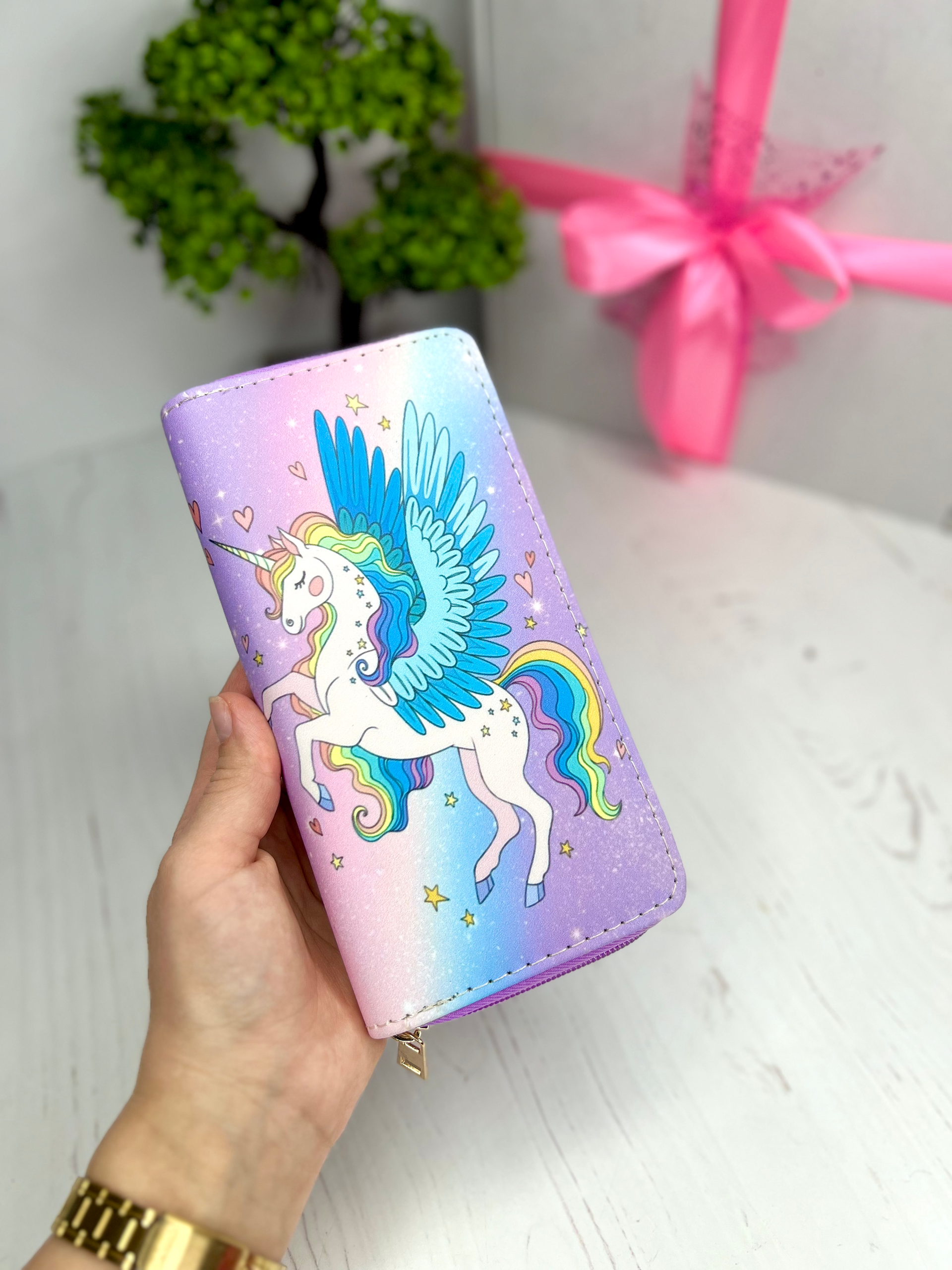 Гаманець розміру під повну купюру, має декілька відділень. Застібається на блискавку. Малюнок з обох сторін однаковий.