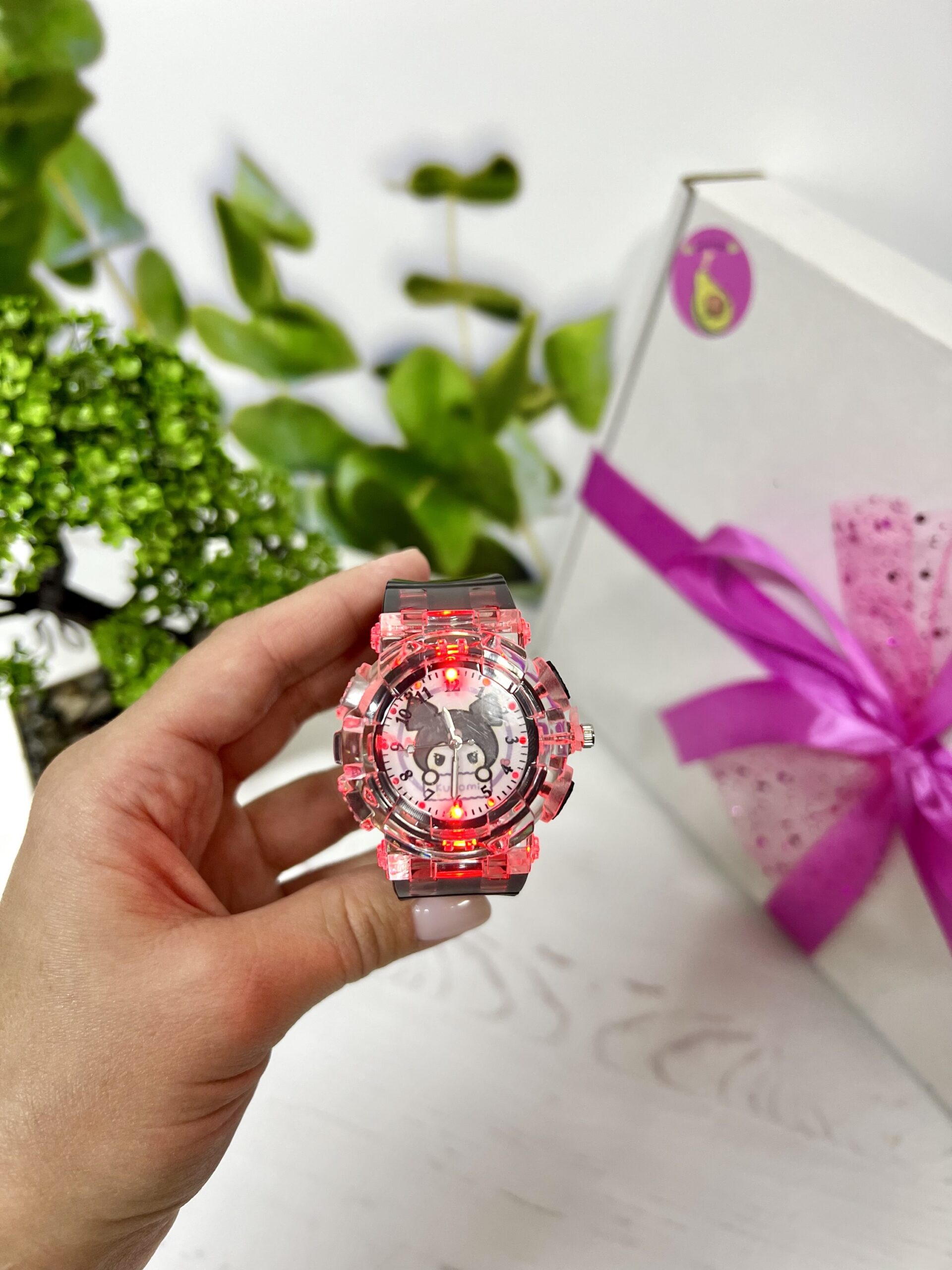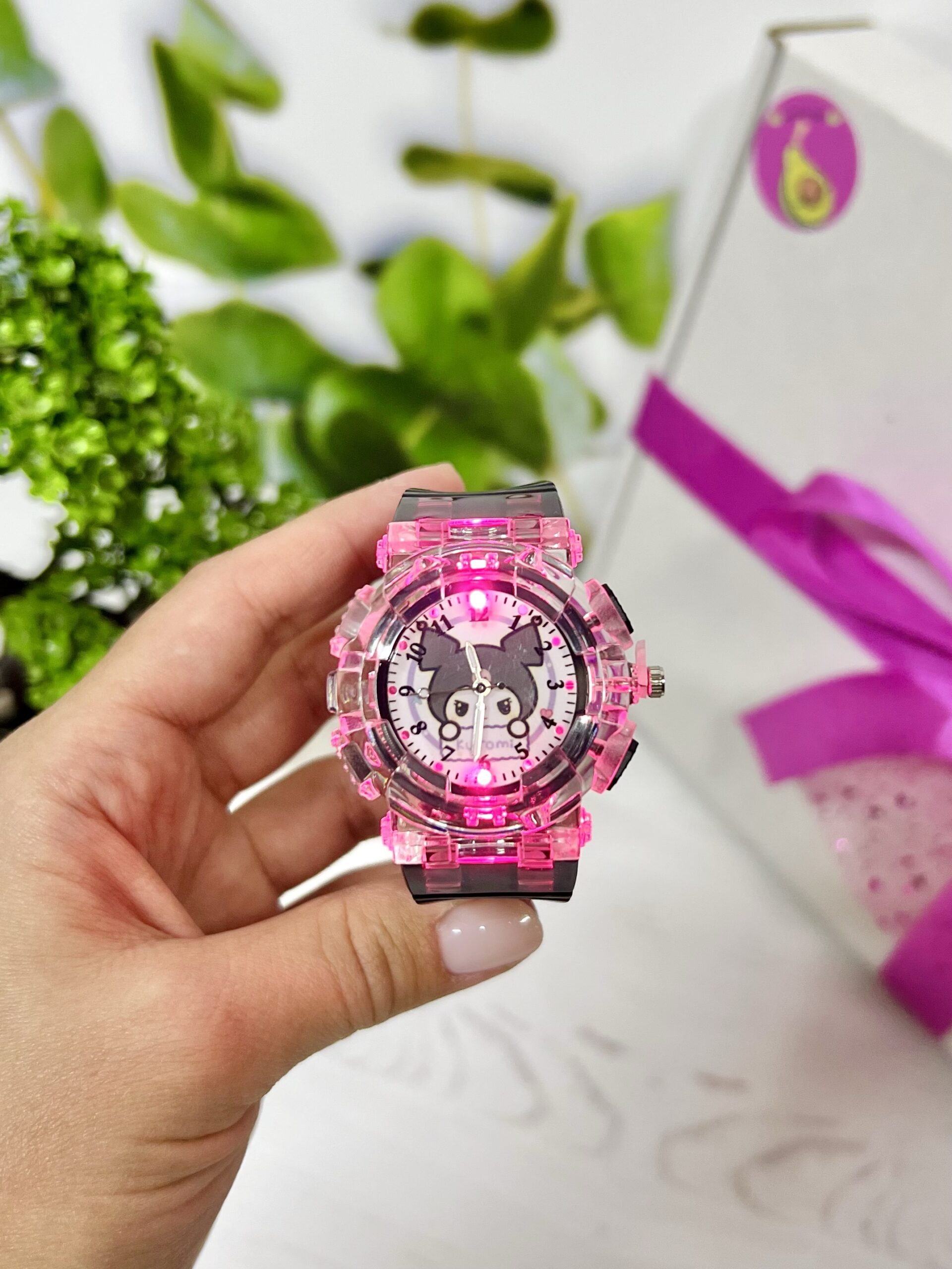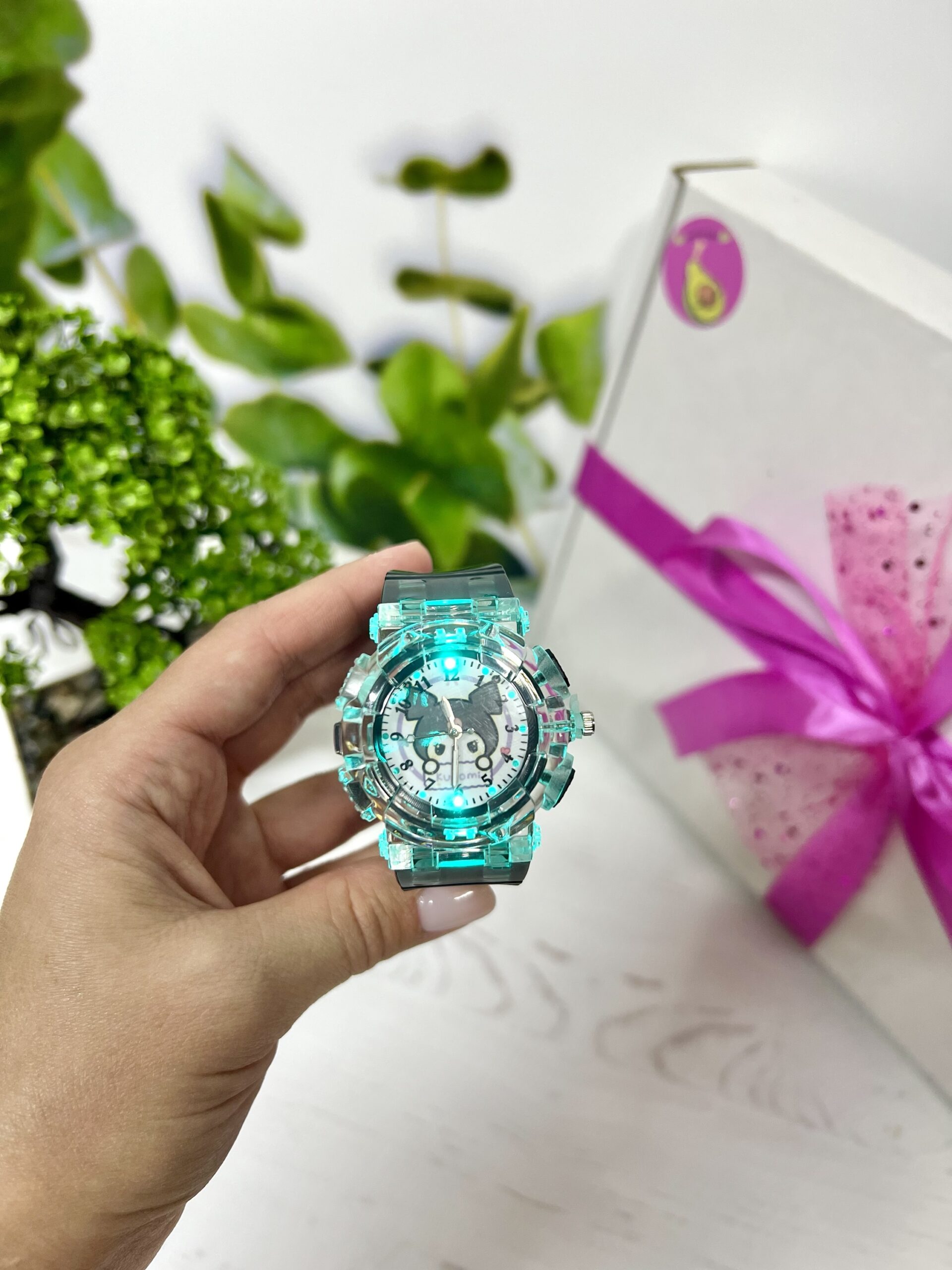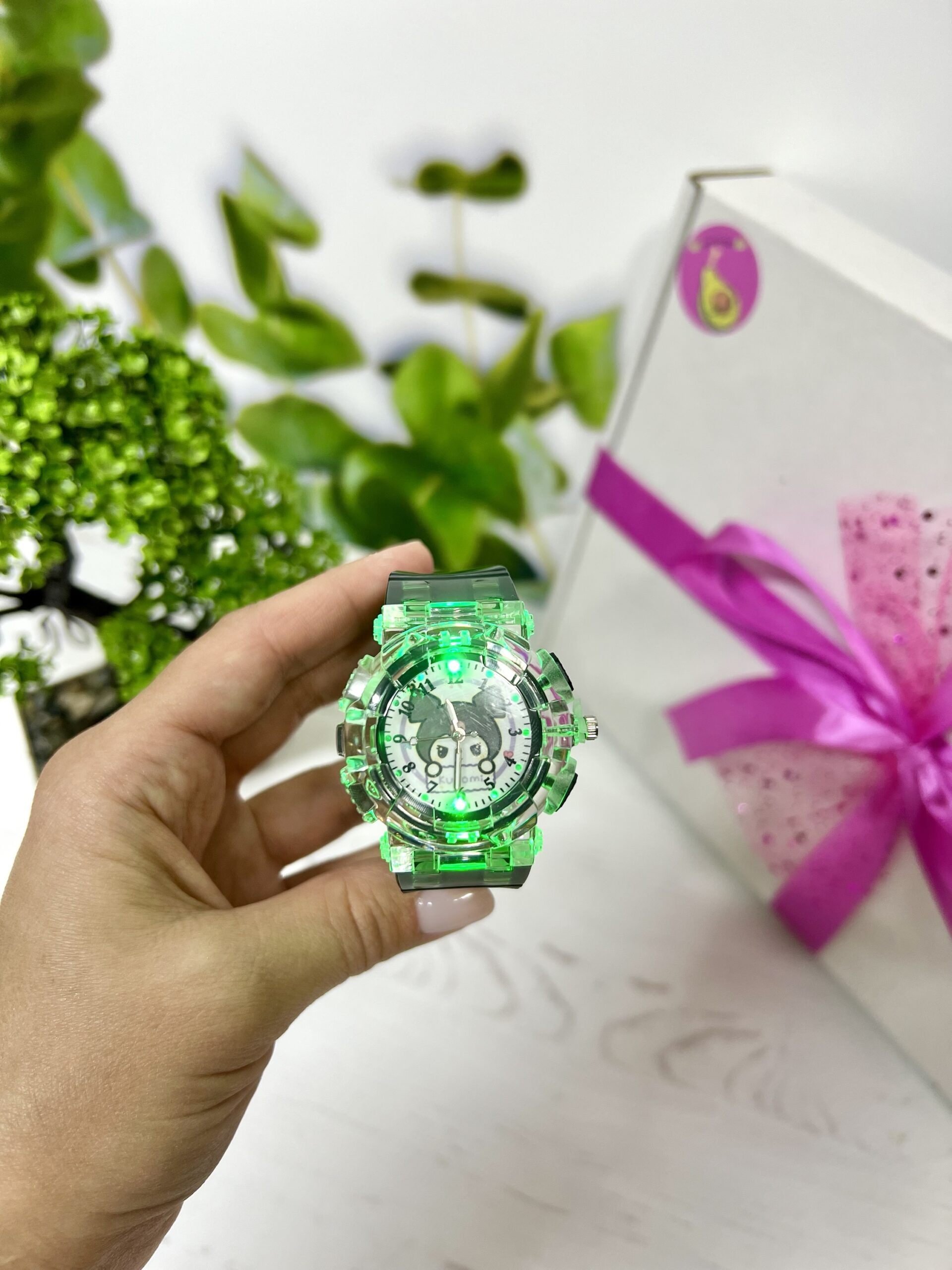 Годинник працює на батарейках. Підсвітка вмикається окремою кнопочкою, світиться різними кольорами. Годинник справжній!
