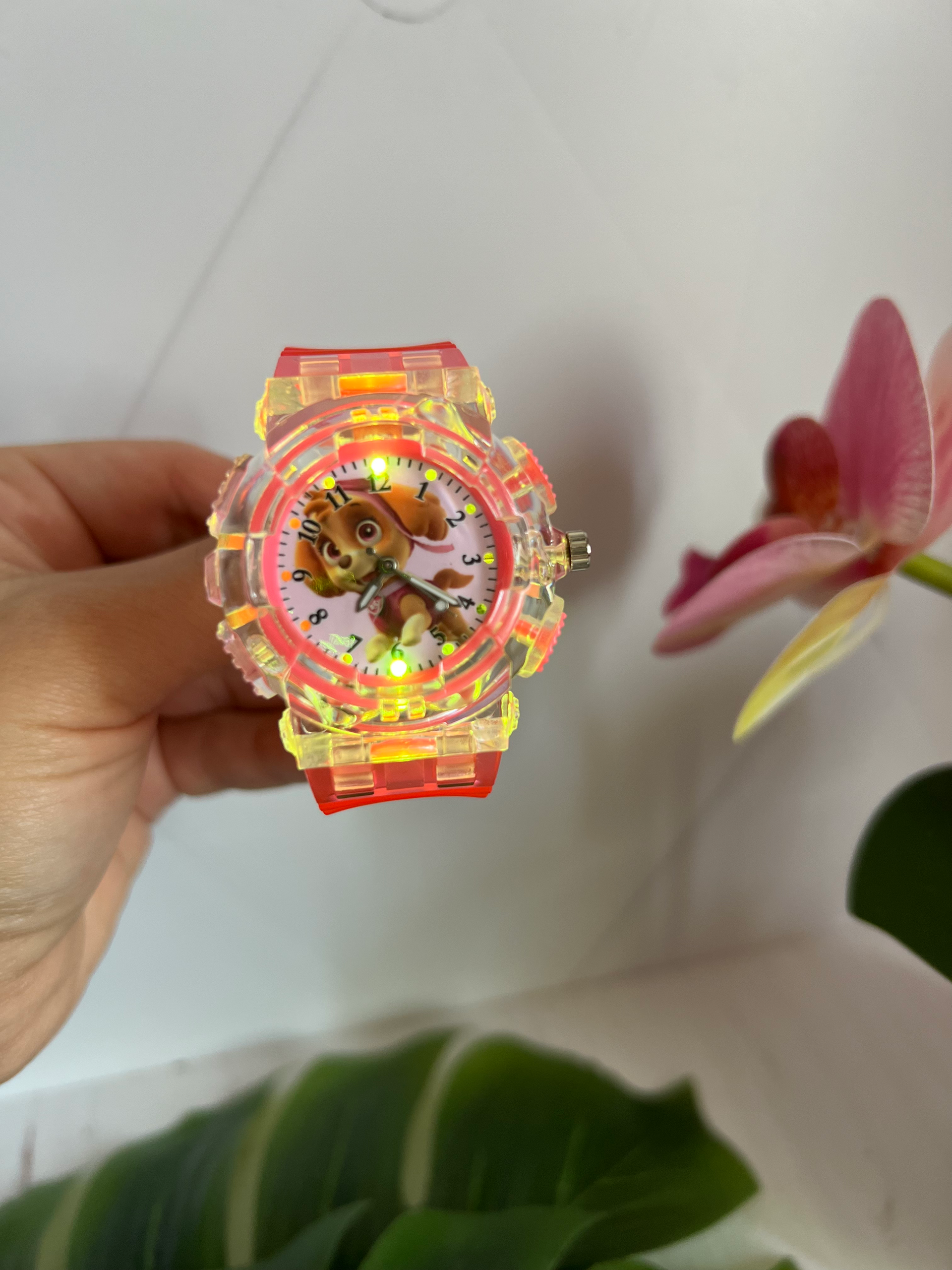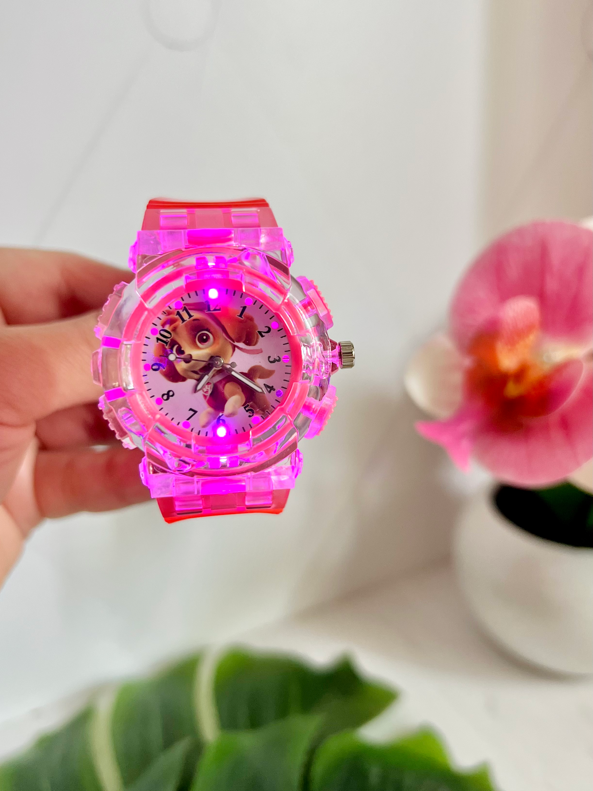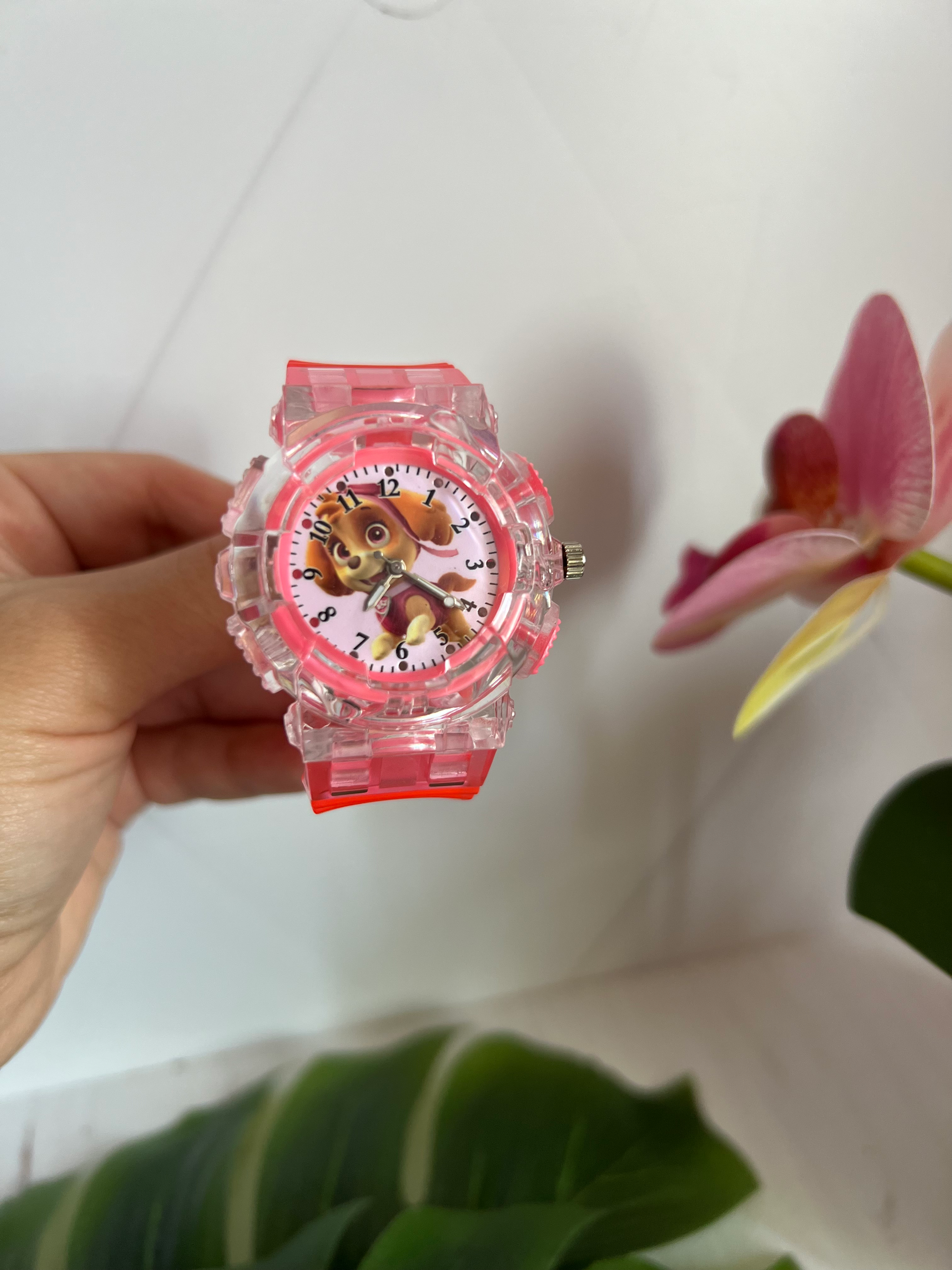 Годинник кварцовий із зображенням Скай із Щенячого патруля. Годинник має підсвітку, яка вмикається окремою кнопочкою та вимикається самостійно через 7-10 сек. На ремінці є багато отворів, тому підійдуть під будь який обʼєм руки.