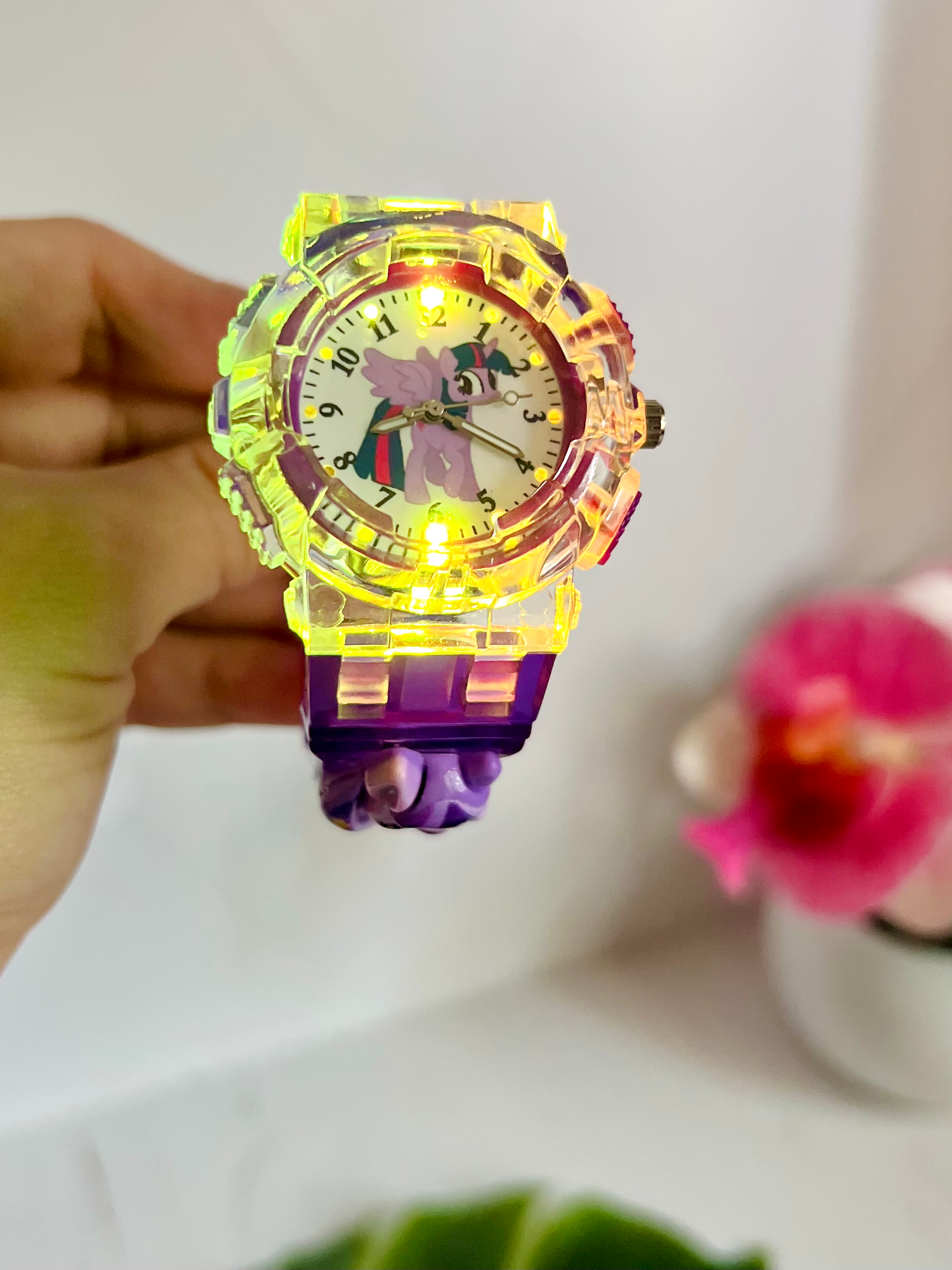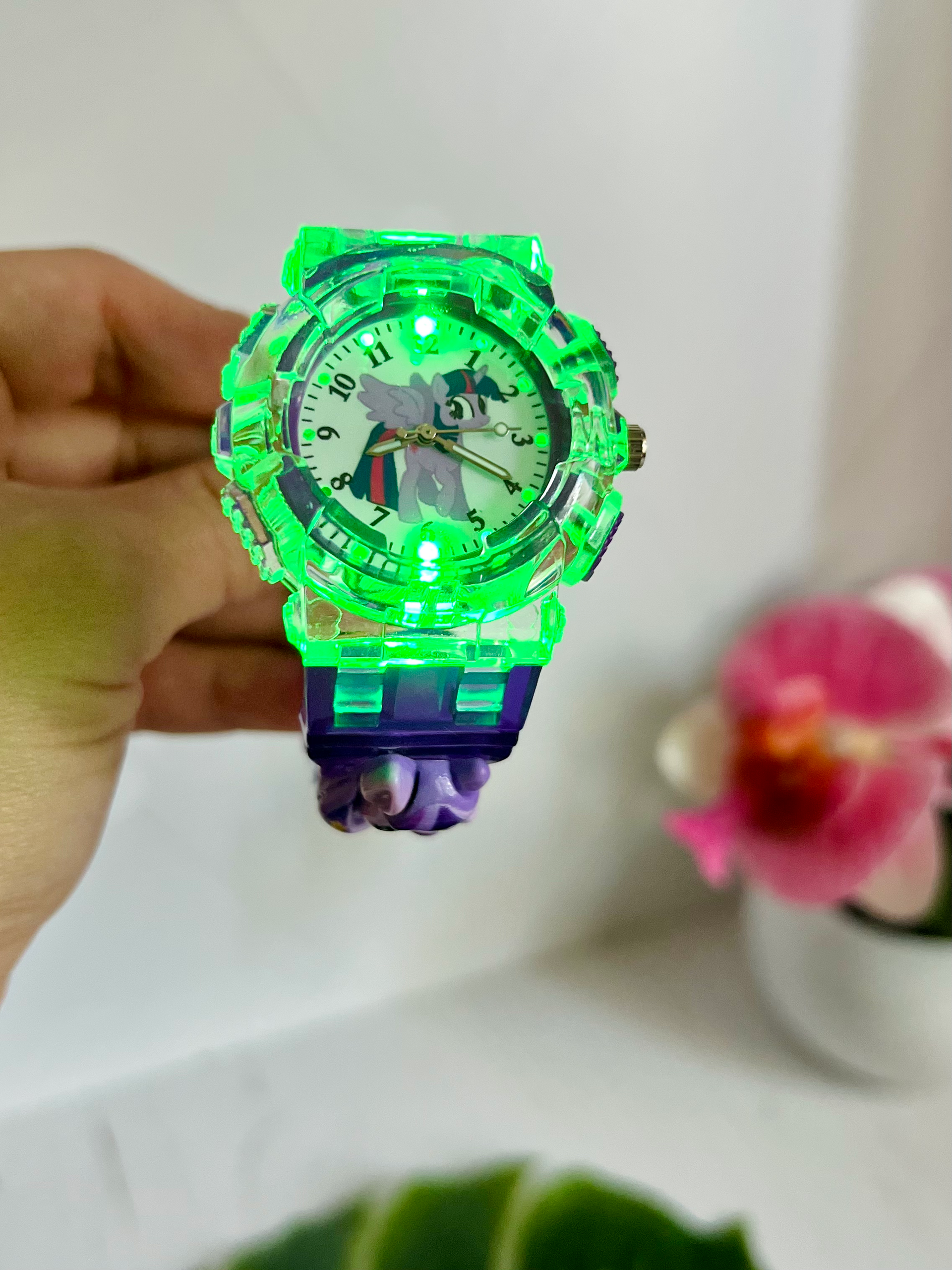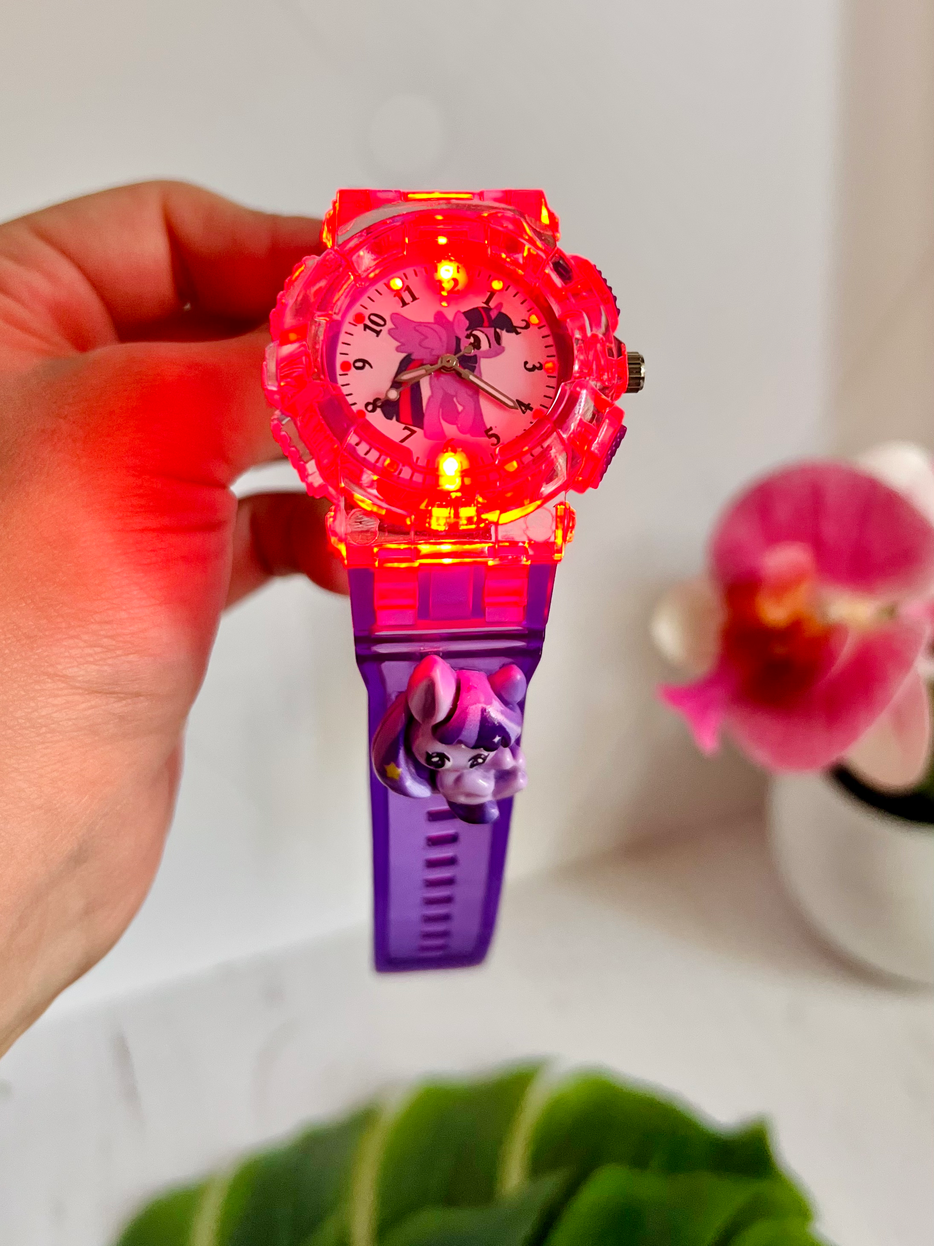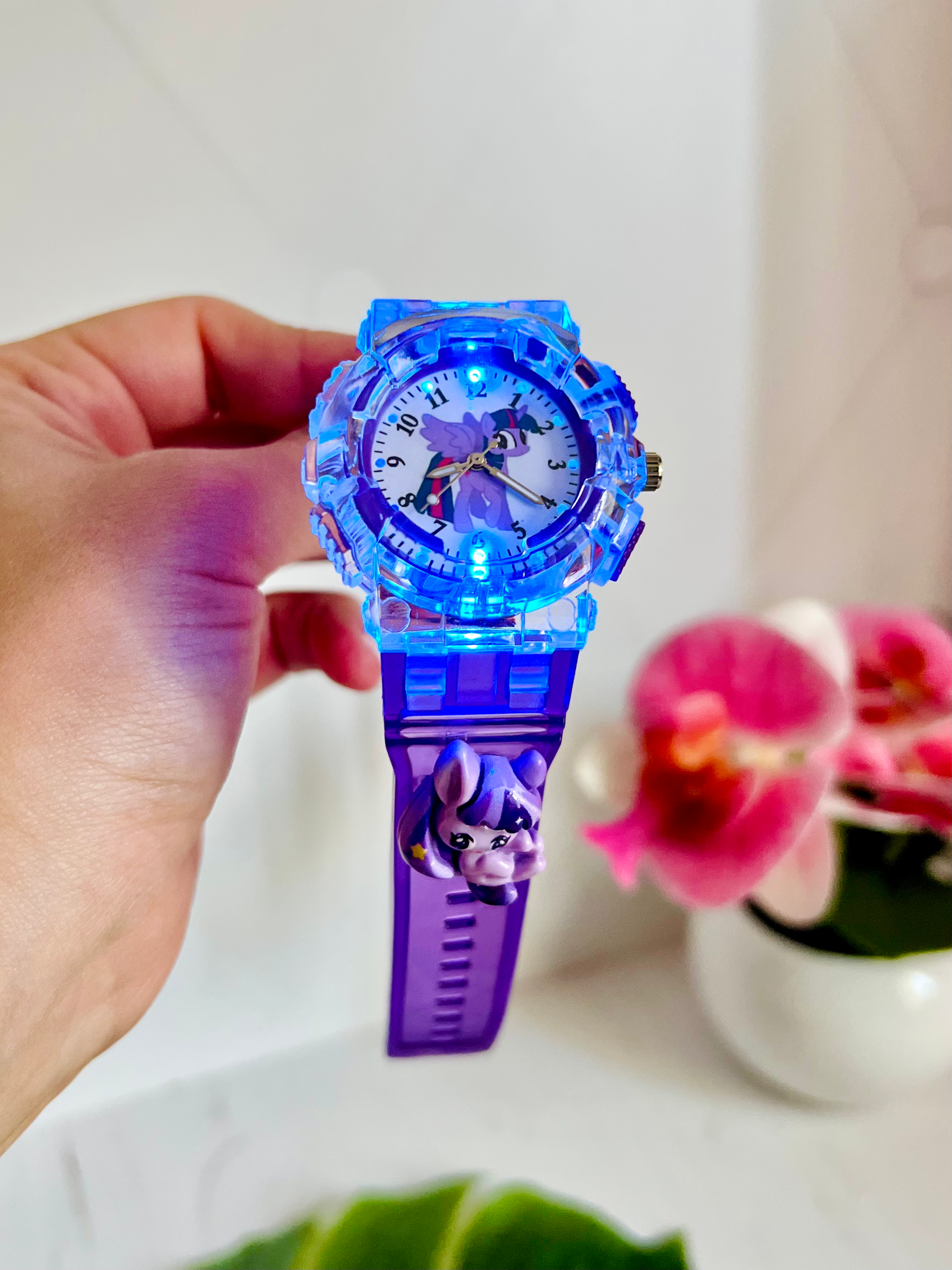 Годинник кварцовий із зображенням поні Твайлайт Спаркл (Іскорки) із мультика My little pony. Годинник має різнокольорову підсвітку, яка вмикається окремою кнопочкою та вимикається самостійно через 7-10 сек. На ремінці є багато отворів, тому підійдуть під будь який обʼєм руки.