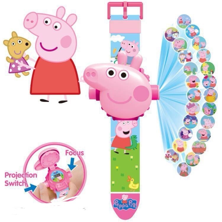 Годинник-проектор має електронний годинник та проектор, який проектує 24 картинки з мультика Свинка Пеппа. Працює від батарейок, входять в комплект.