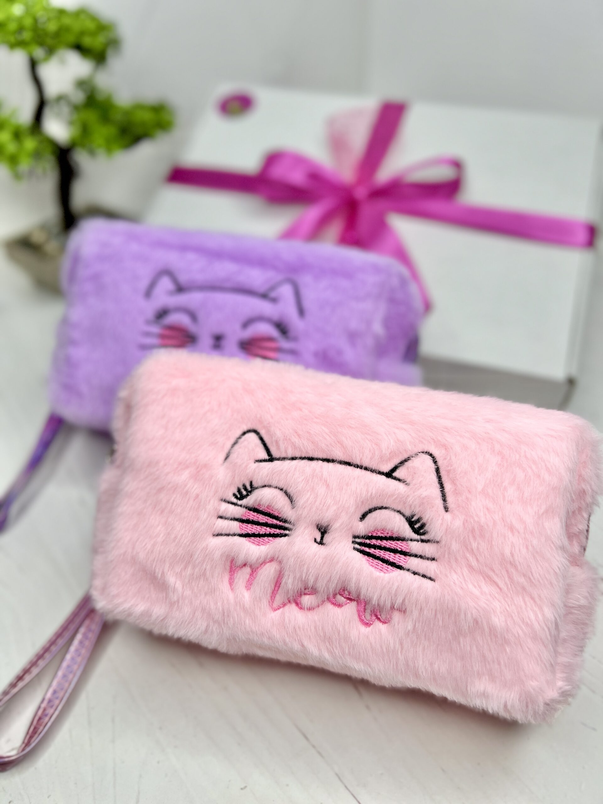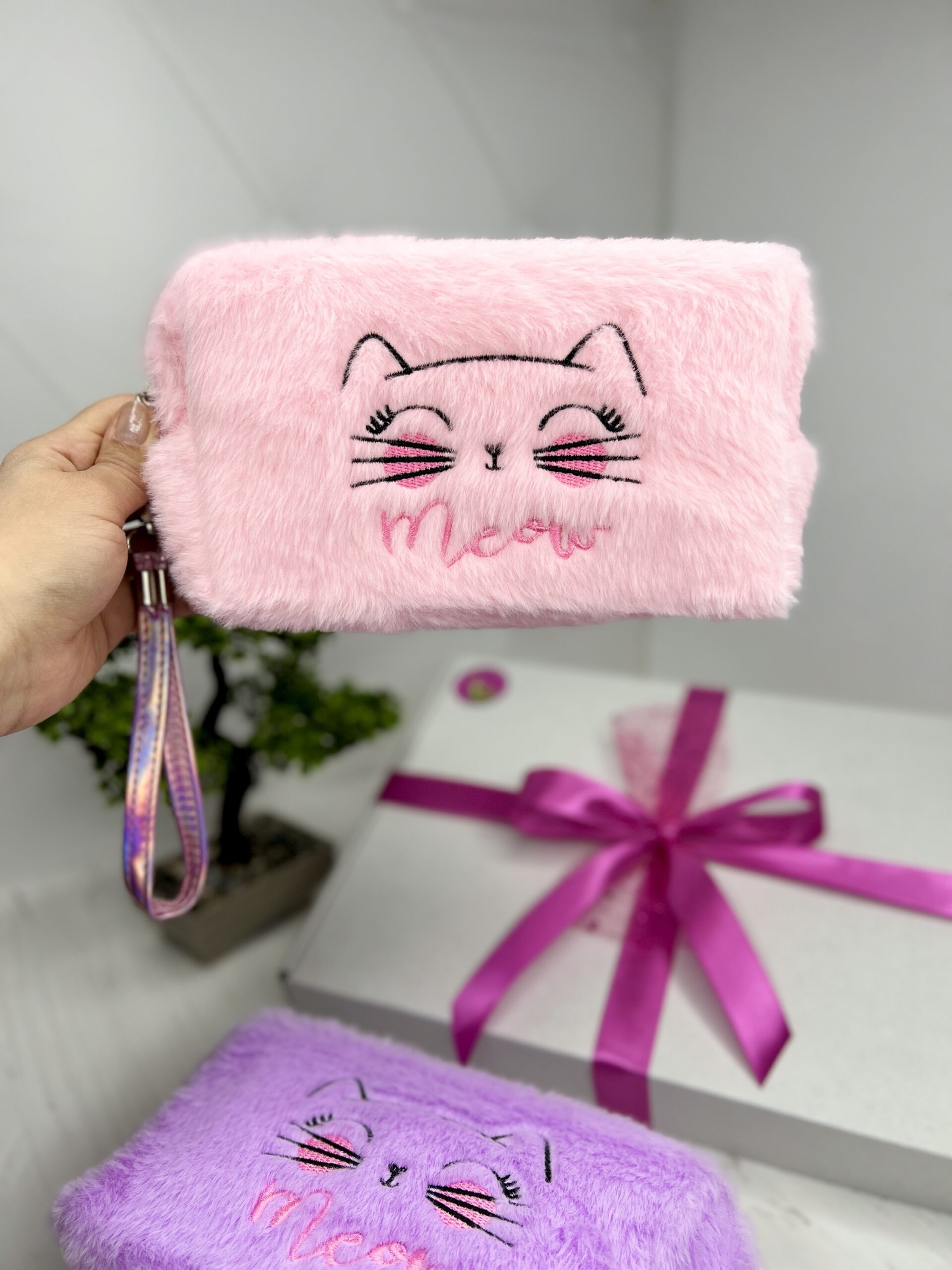 Плюшева косметичка Котик. Вмістка з якісних матеріалів в приємних кольорах: рожевий і бузковий.