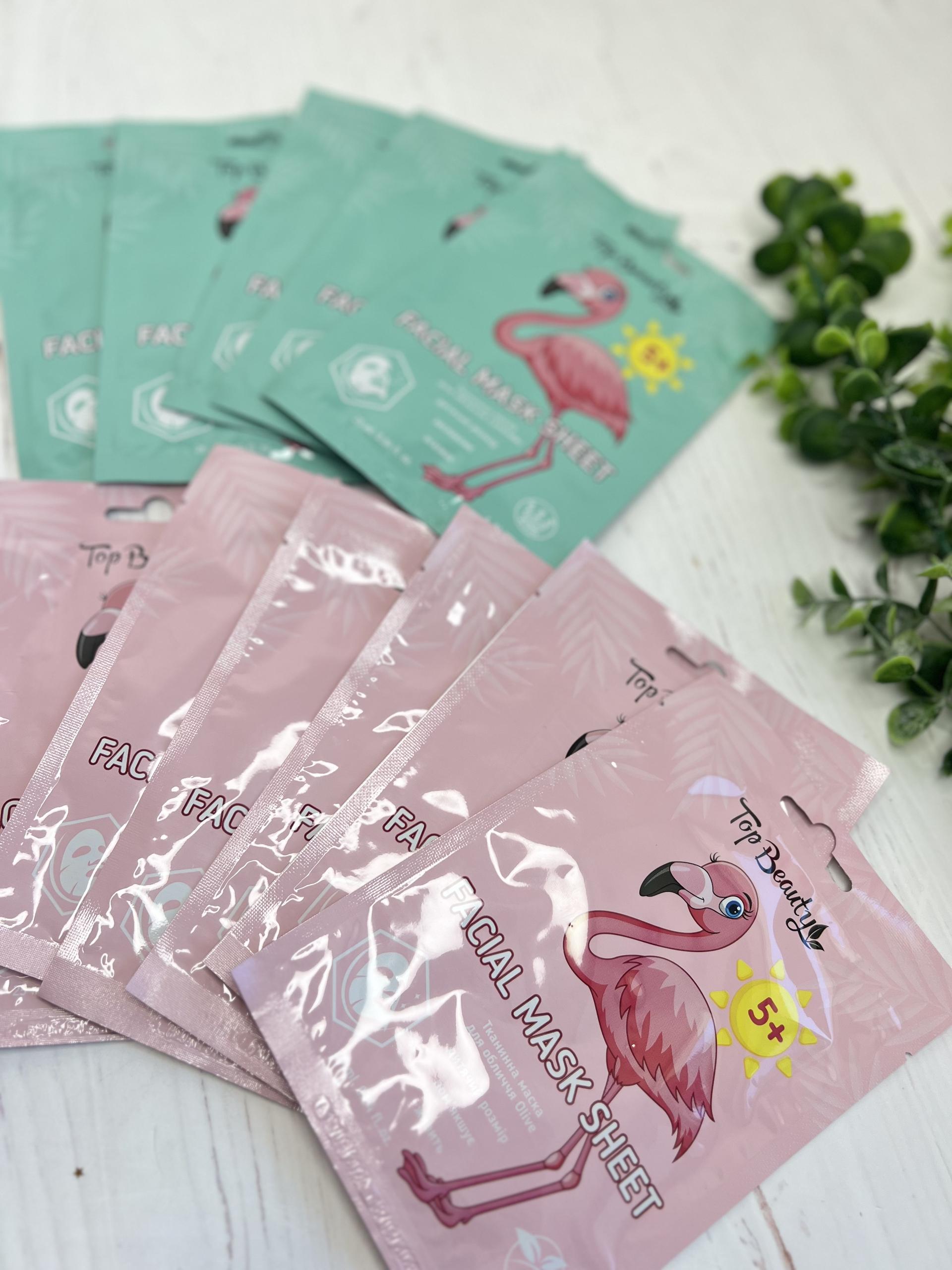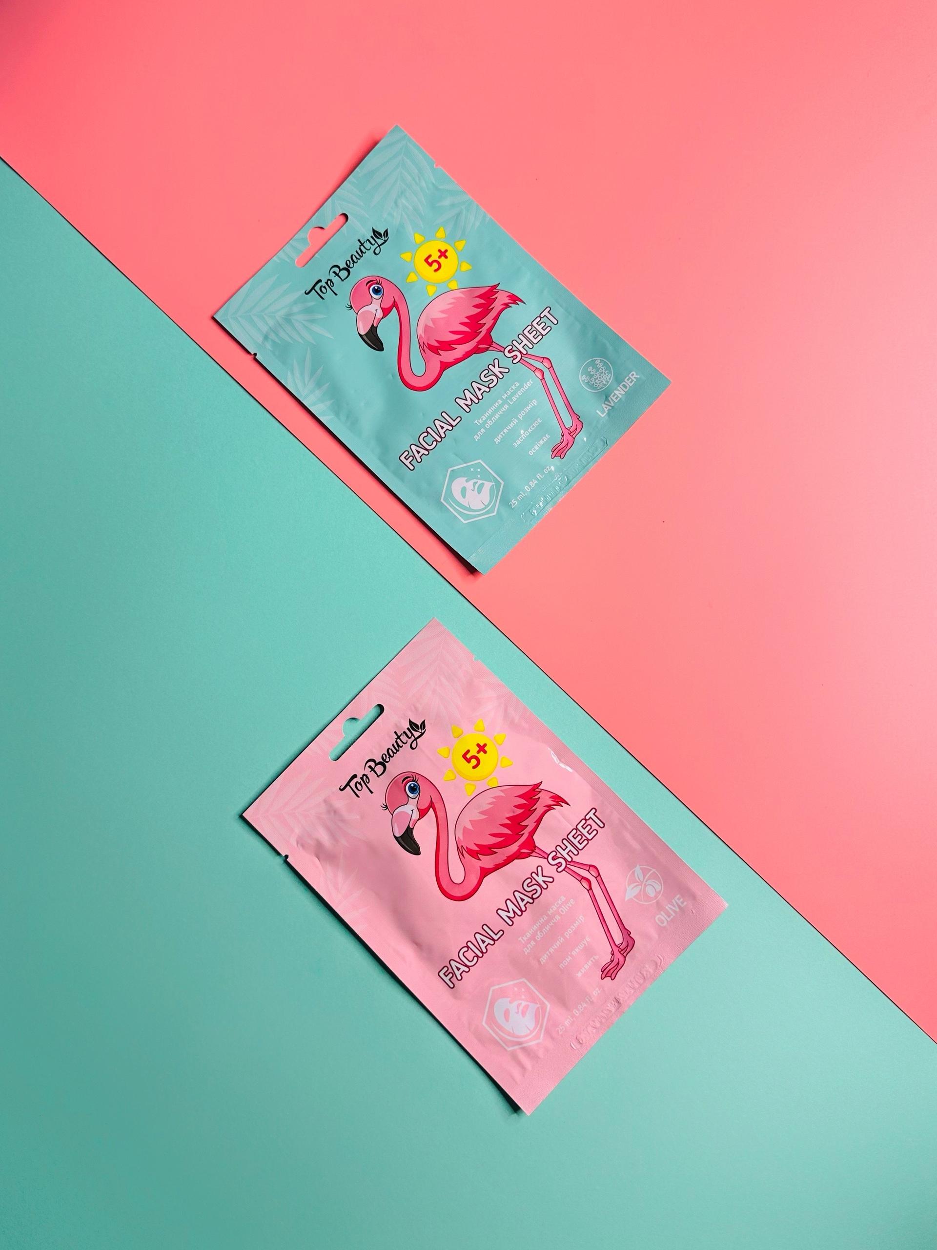 Маски для обличчя “Top Beauty – ідеальний вибір для зволоження та освіження вашої шкіри! Доступні у двох варіантах: з екстрактом лаванди для заспокоєння та з оливковою олією для глибокого живлення. Кожна маска містить SPF 5+ для легкого захисту від сонця. Яскравий дизайн із фламінго додасть настрою вашому догляду за шкірою!