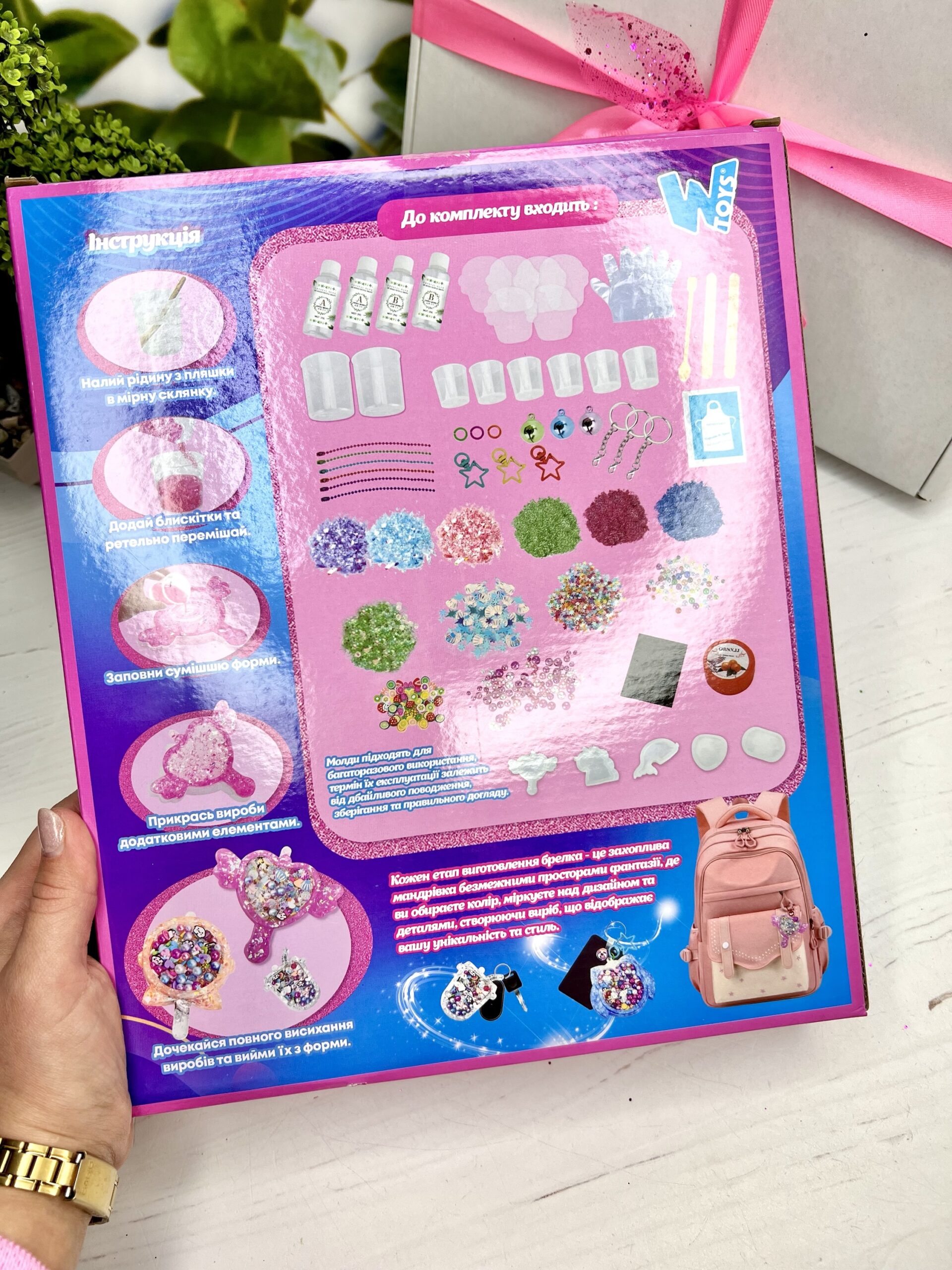 Захопливий набір для створення яскравих акрилових прикрас з блискітками. Дитина власноруч виготовить унікальні брелоки або підвіски, розвиваючи фантазію, дрібну моторику та творчі навички. Чудовий варіант для подарунка та корисного дозвілля.