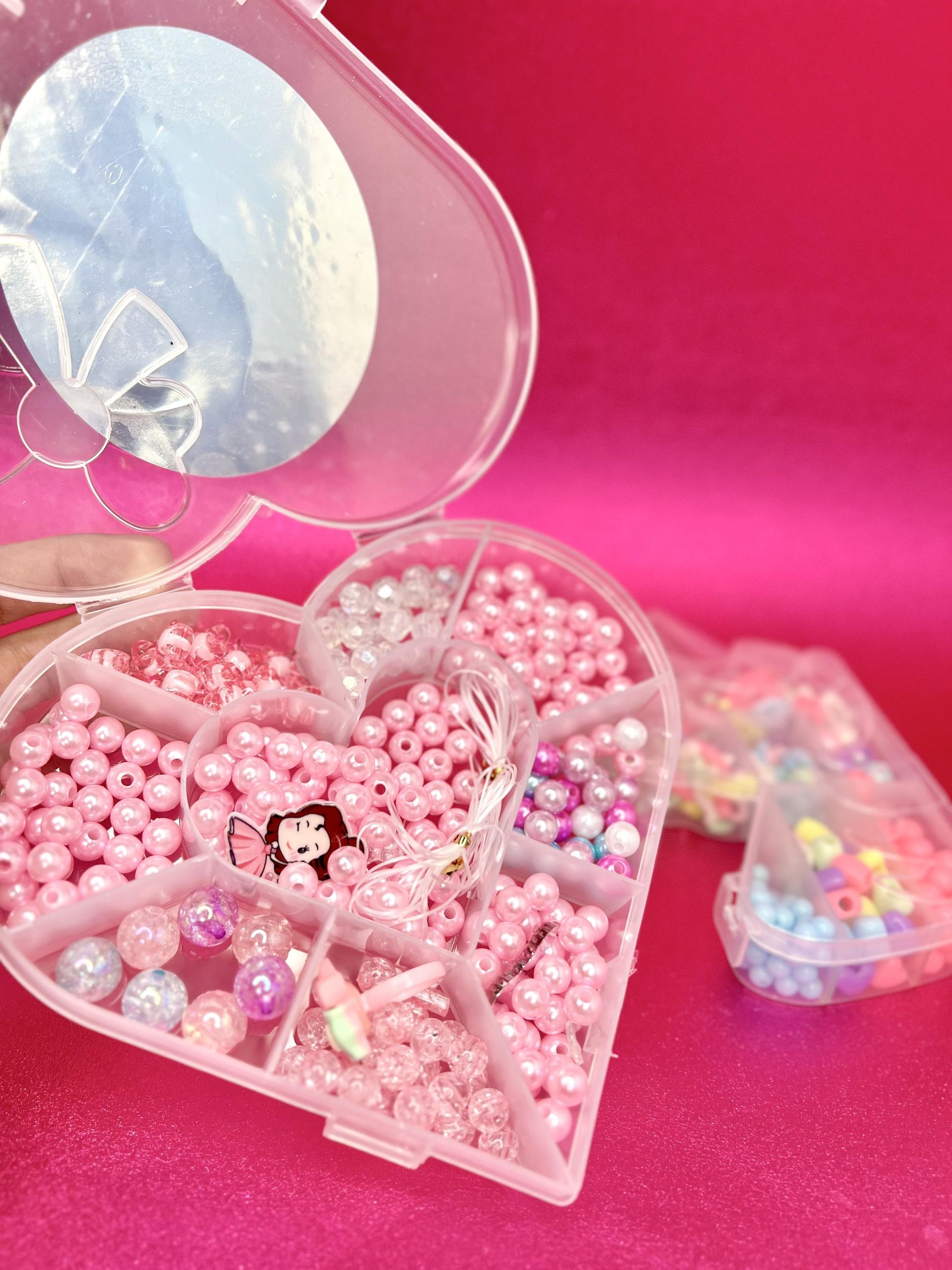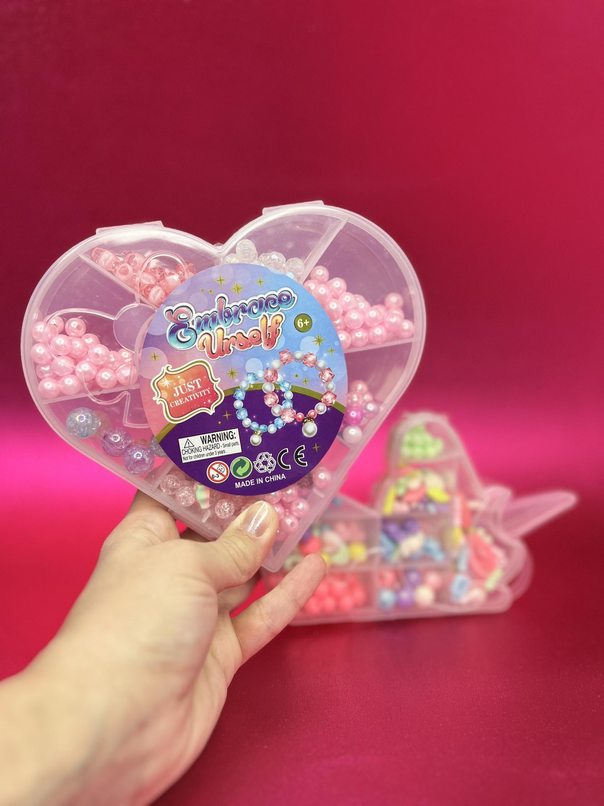Набір представляє собою скриньку у формі серця, яка містить різномані намистини та нитку для створення прикрас.