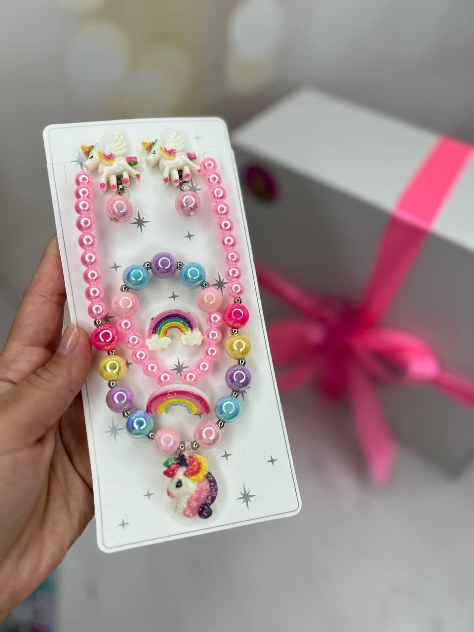 Набір прикрас “Єдиноріжка” – ідеальний подарунок для маленьких принцес! У комплекті: намисто, браслет, кілечко, кліпси з яскравими перлинами, чарівними єдинорогами, веселками та хмаринками. Виготовлений із безпечних матеріалів, набір додасть казкового настрою до будь-якого образу. Для дітей від 3 років