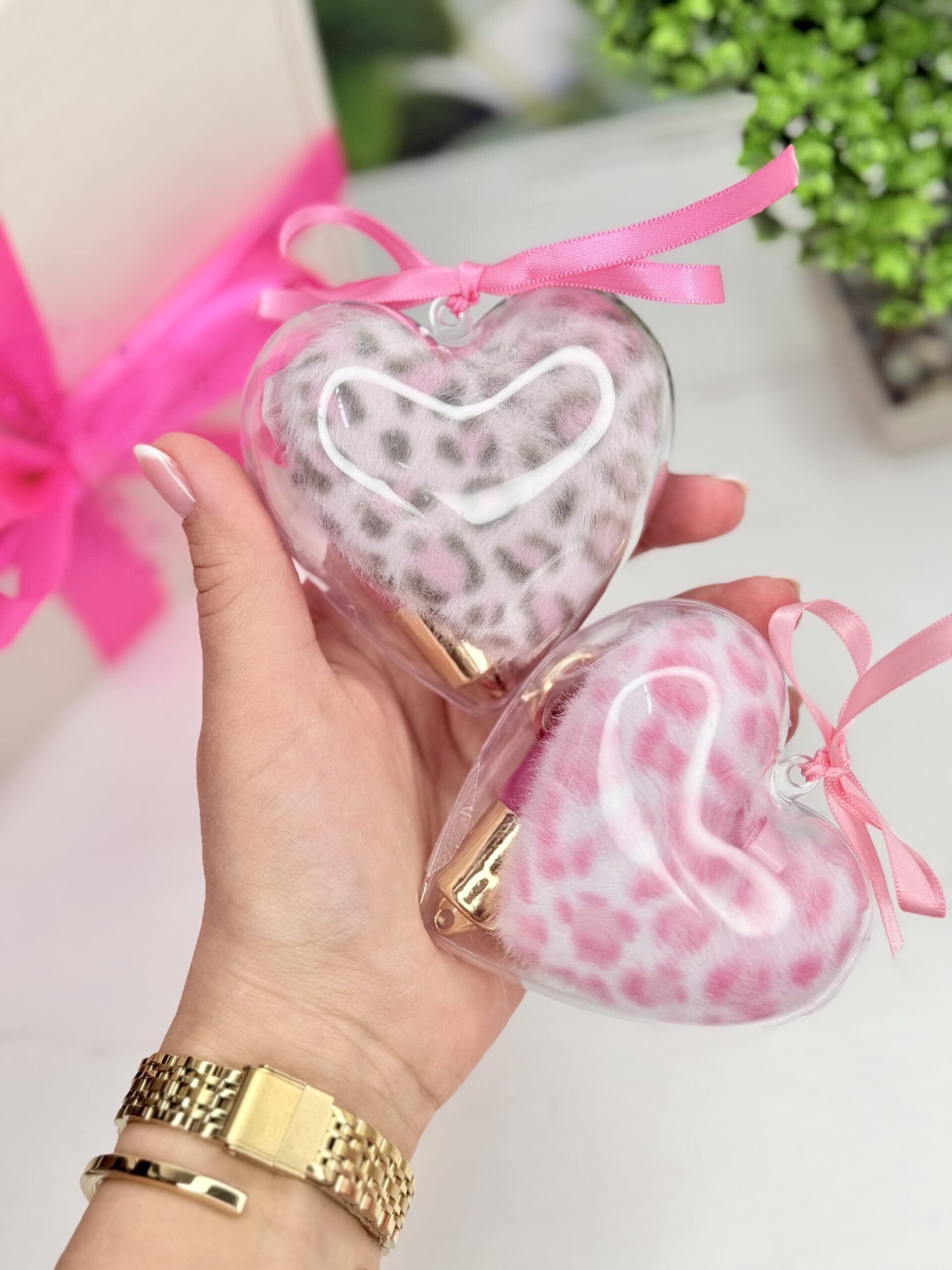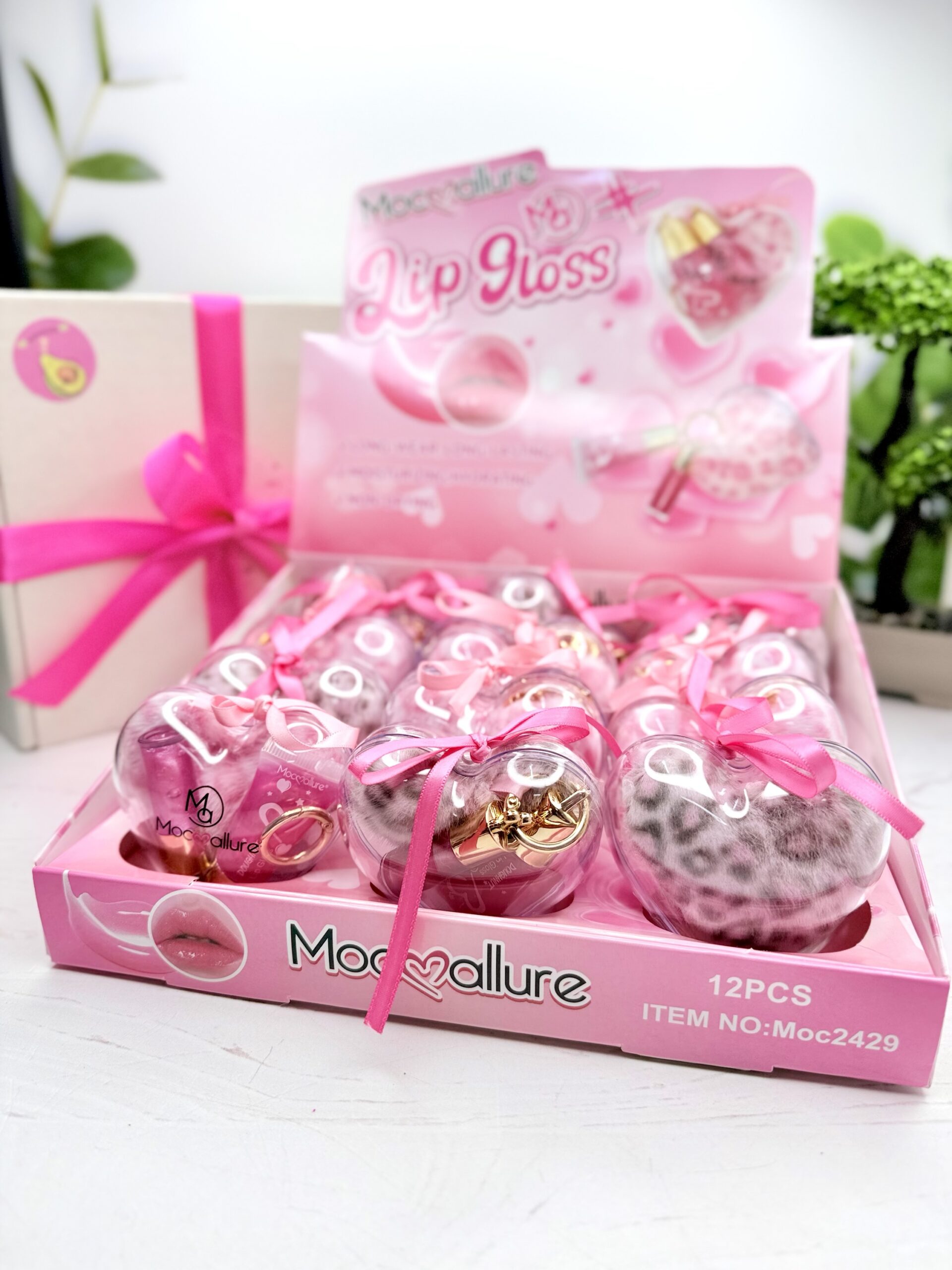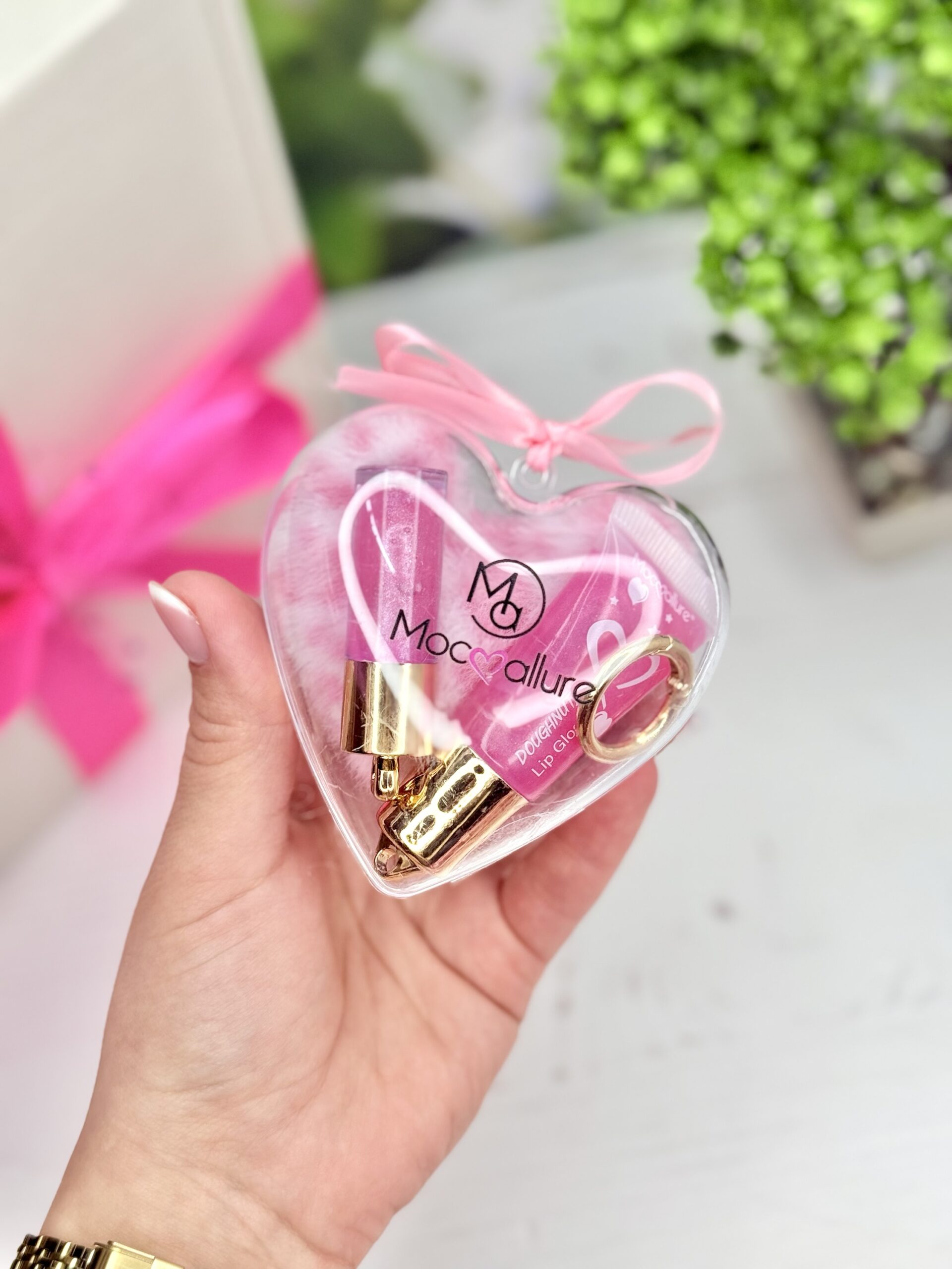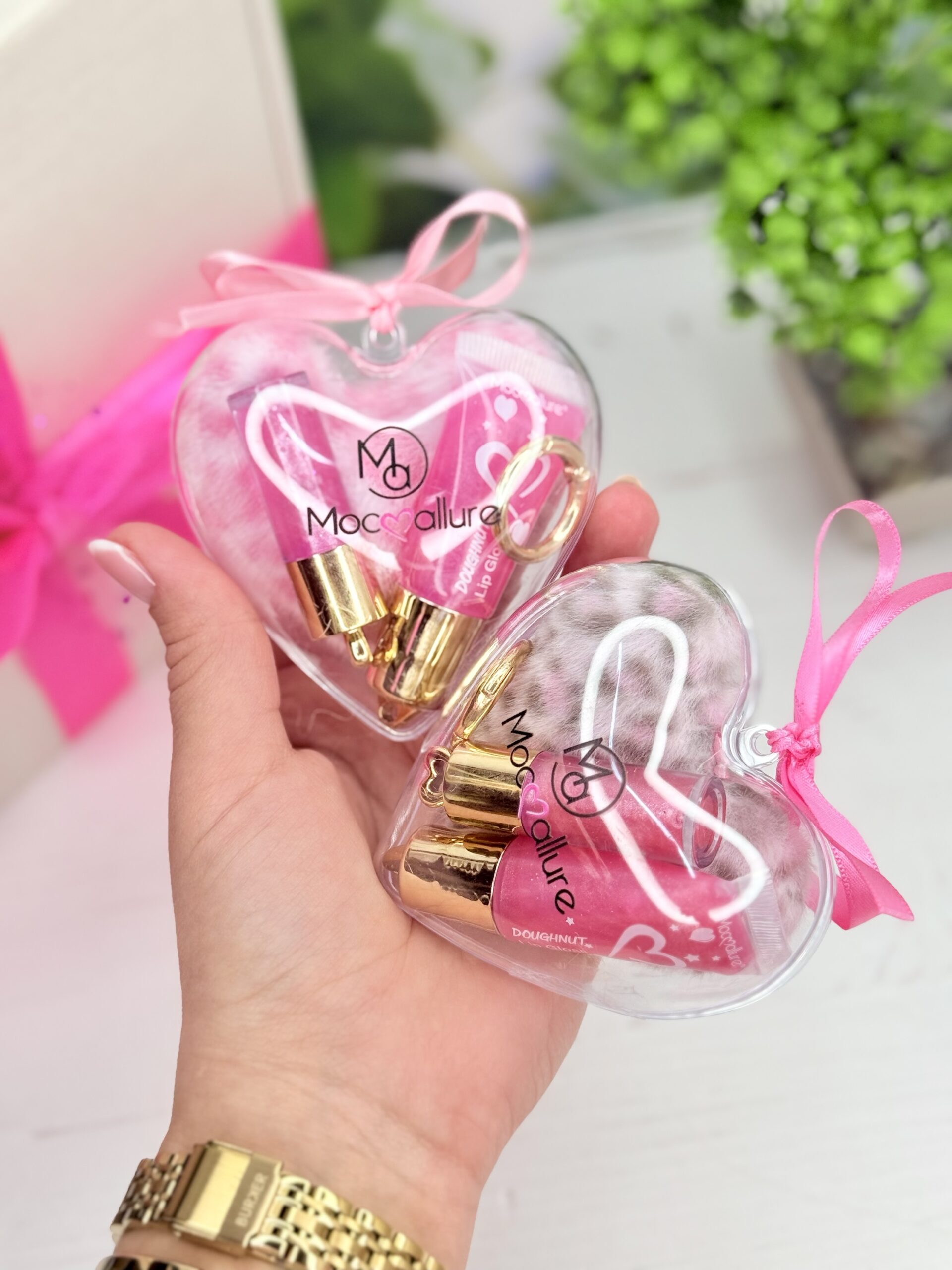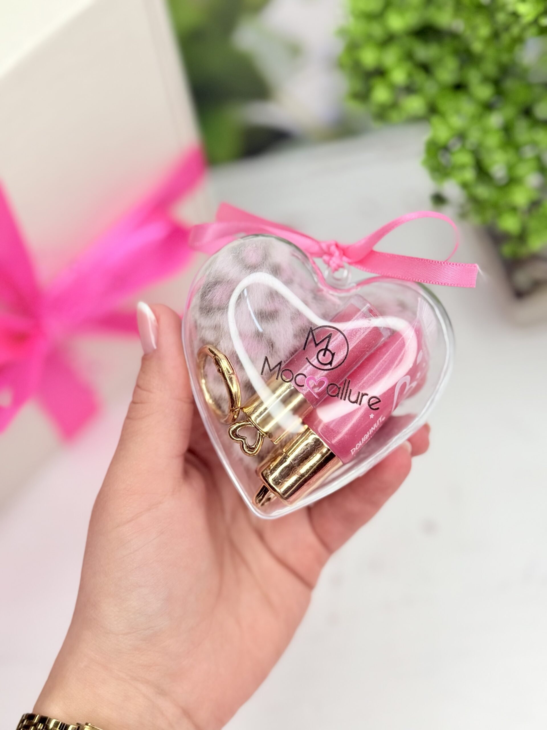 До набору водить хутряний брелок-серце та два блиски для губ, які гарно упаковані в прозорий футляр у формі серця.