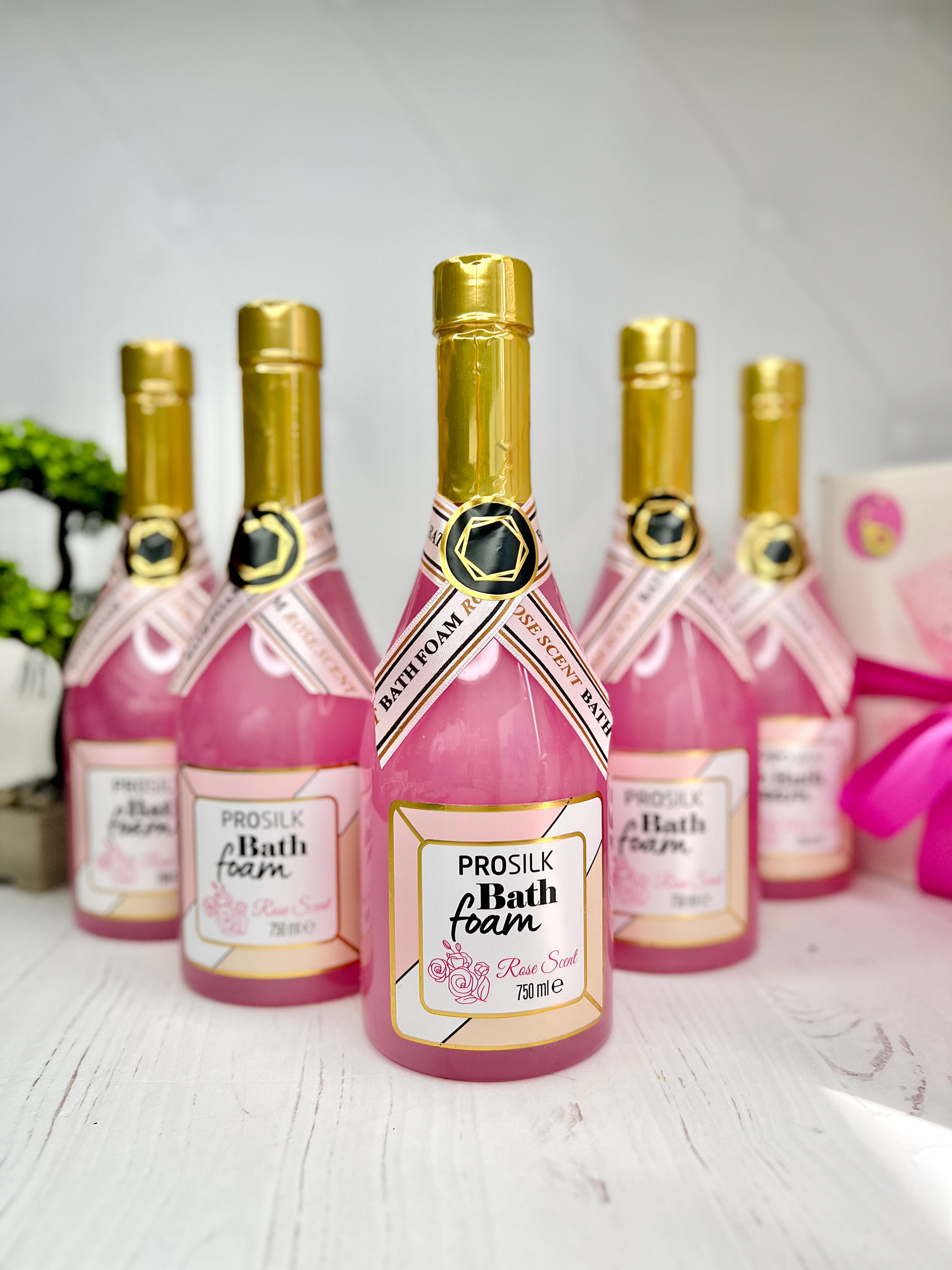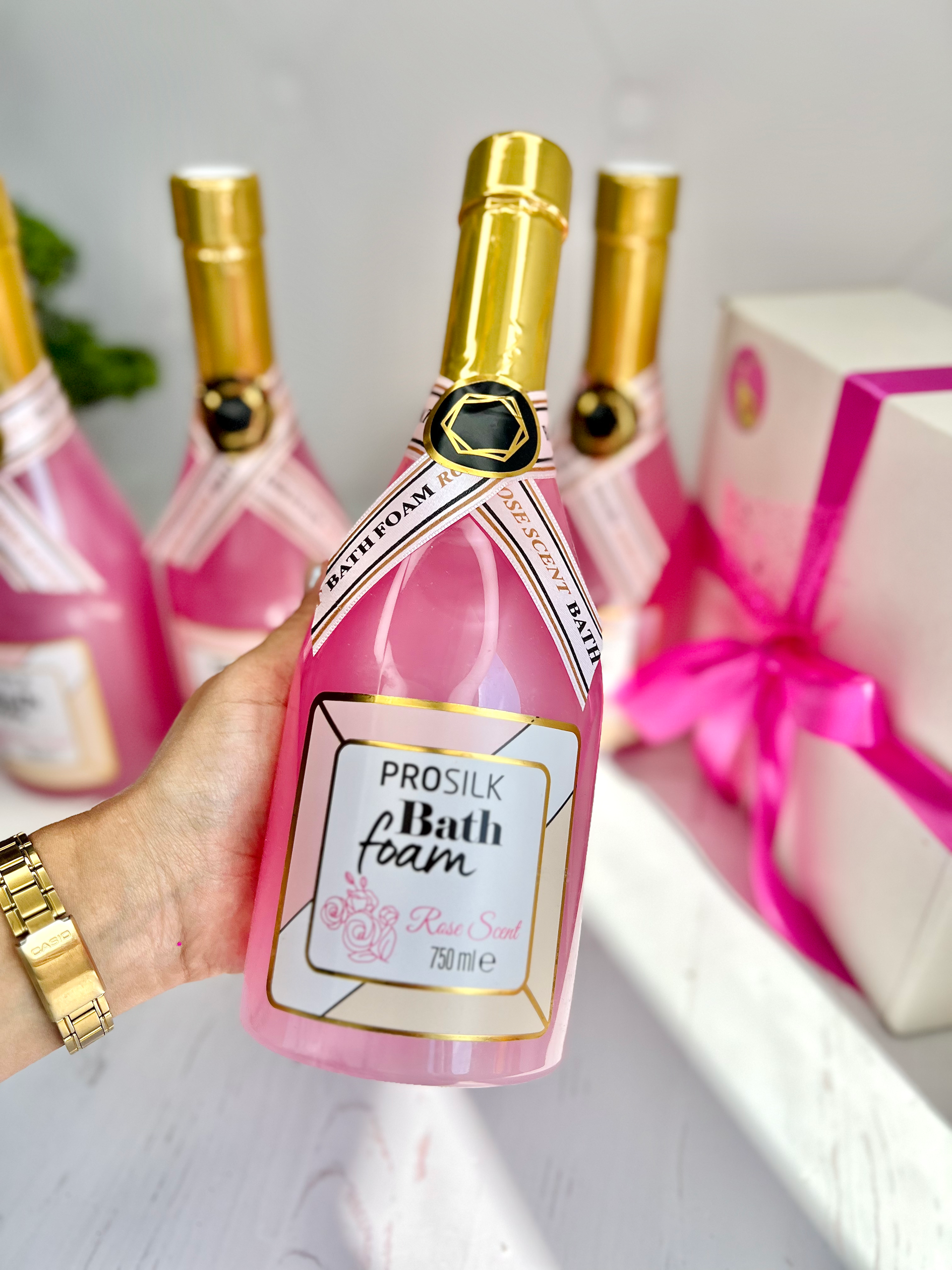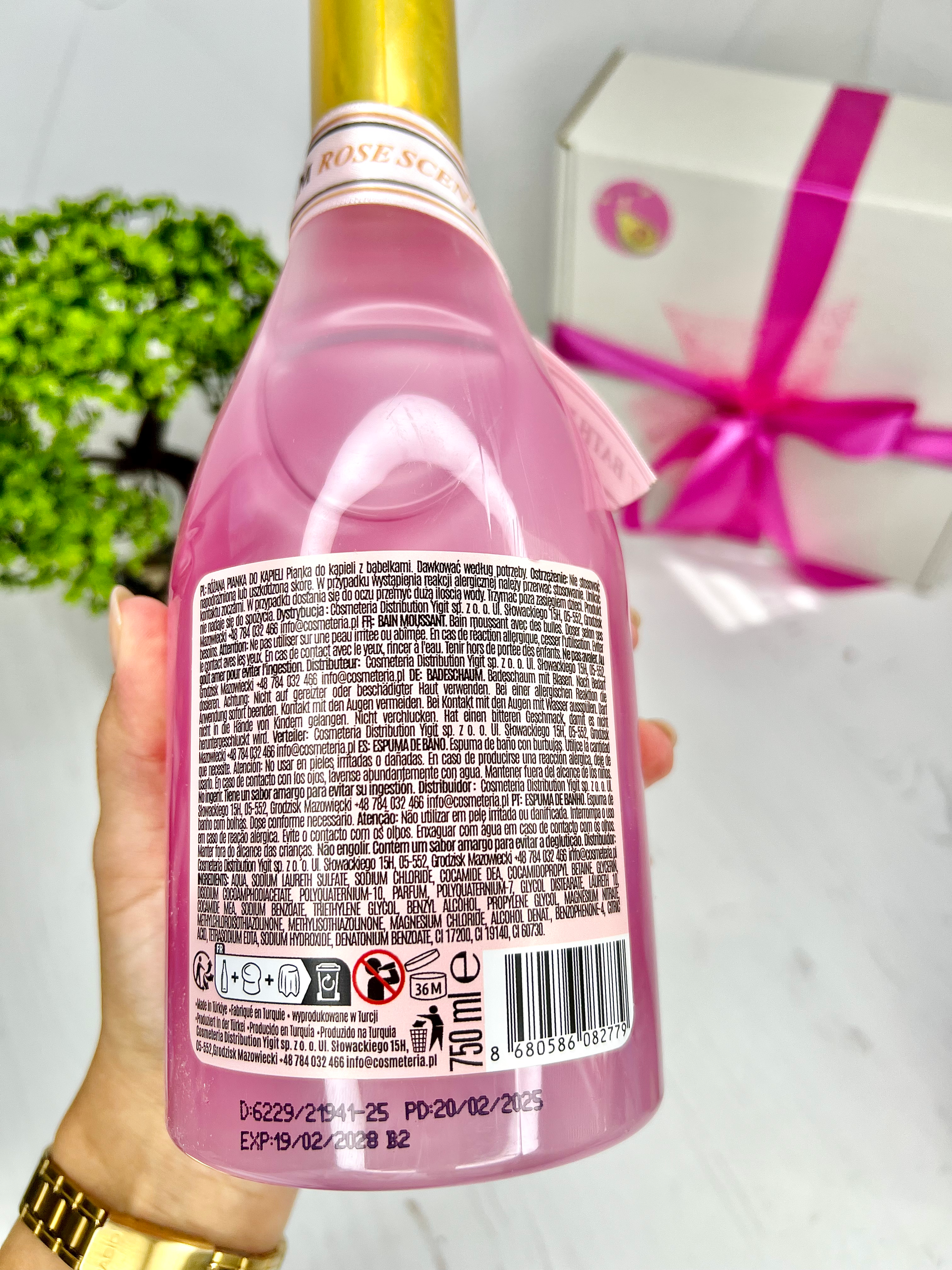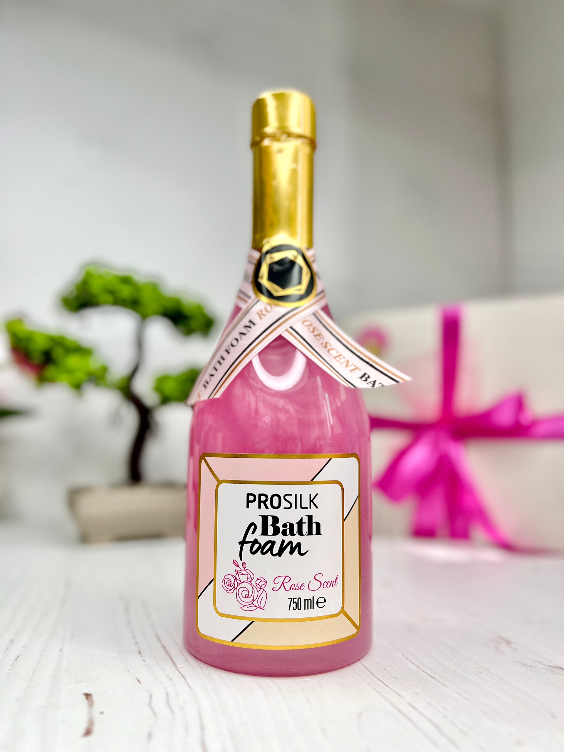 Піна для ванни у вигляди пляшки шампанського. Аромат троянди. Розчиняти під струменем води! Обʼєм 750 мл