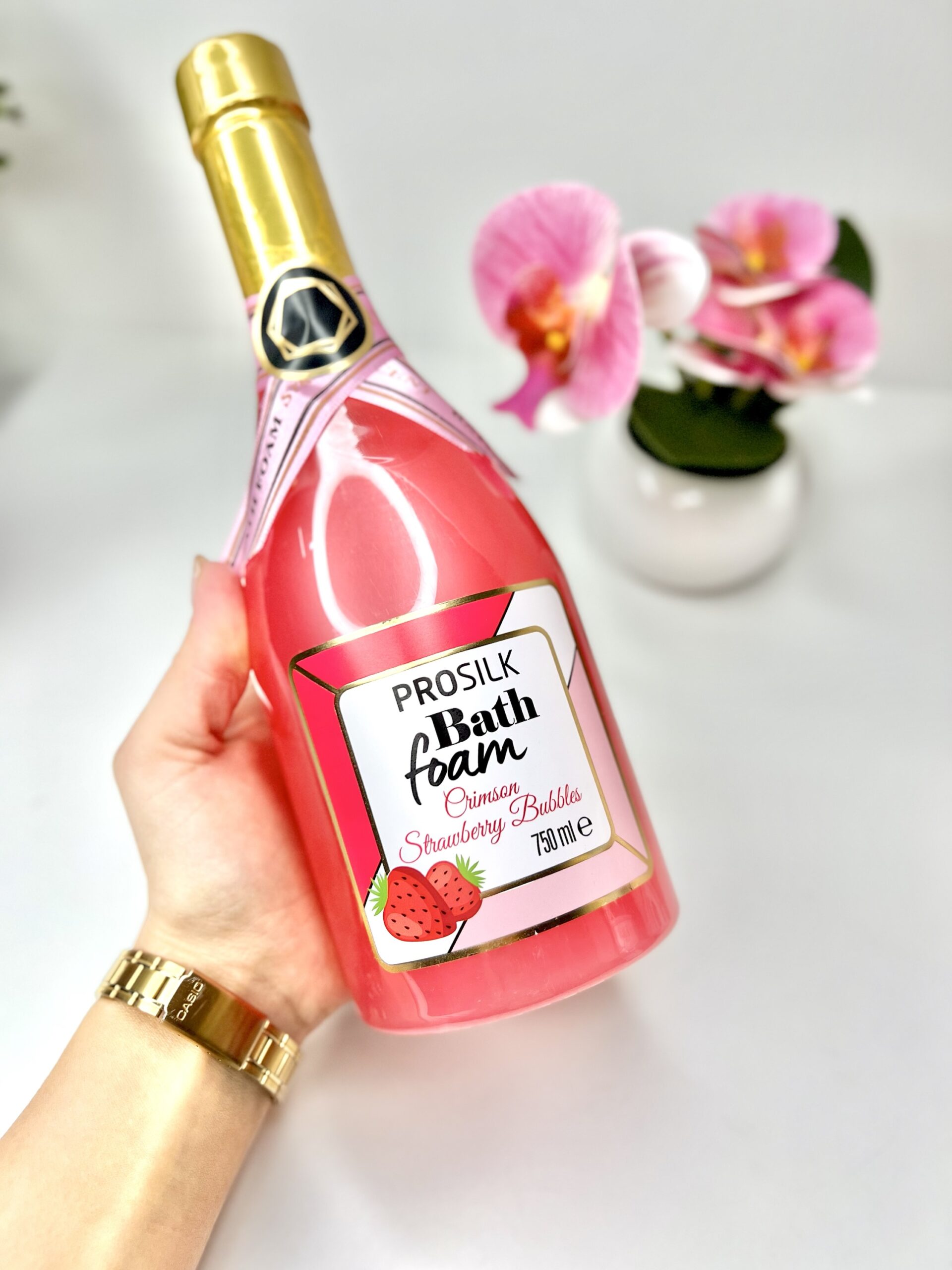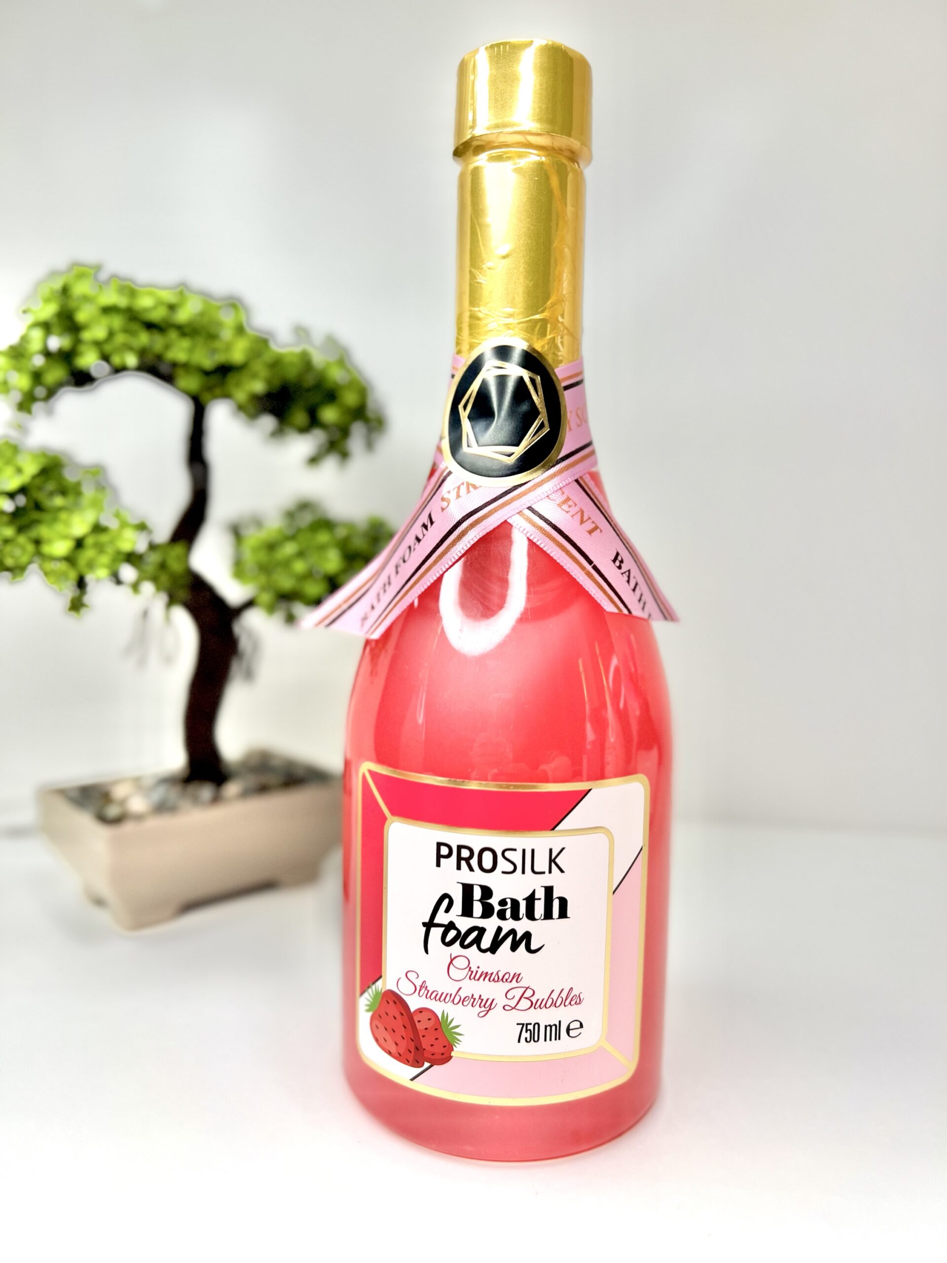 Піна для ванни в оформленні шампанського. Аромат полуниця. Обʼєм 750 мл. Для утворення піни потрібно розчиняти під струменем води.