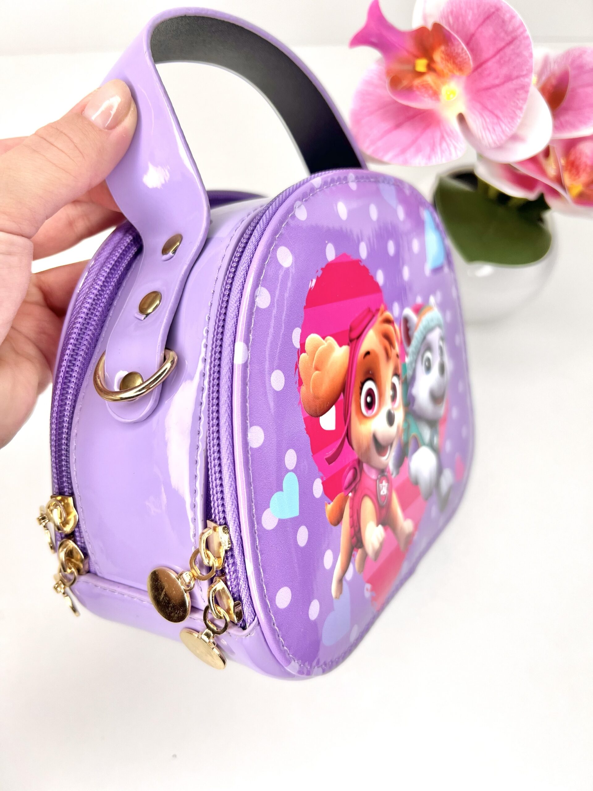 Дитяча лакована сумочка, застібка на змійці. Довгий ремінь в комплекті, регулюється по довжину. Розмір 19х15х8 см.