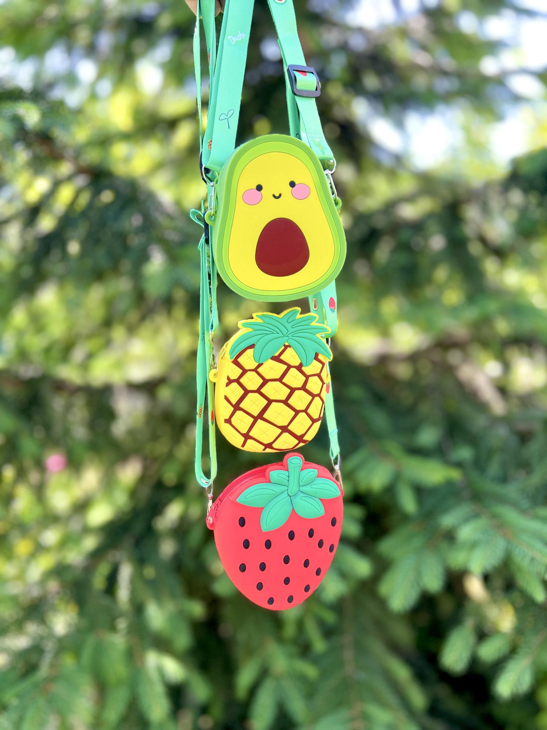 Сумочки силіконові у вигляді фруктів. Застібаються на змійку. Ремінець регулюється по довжині.