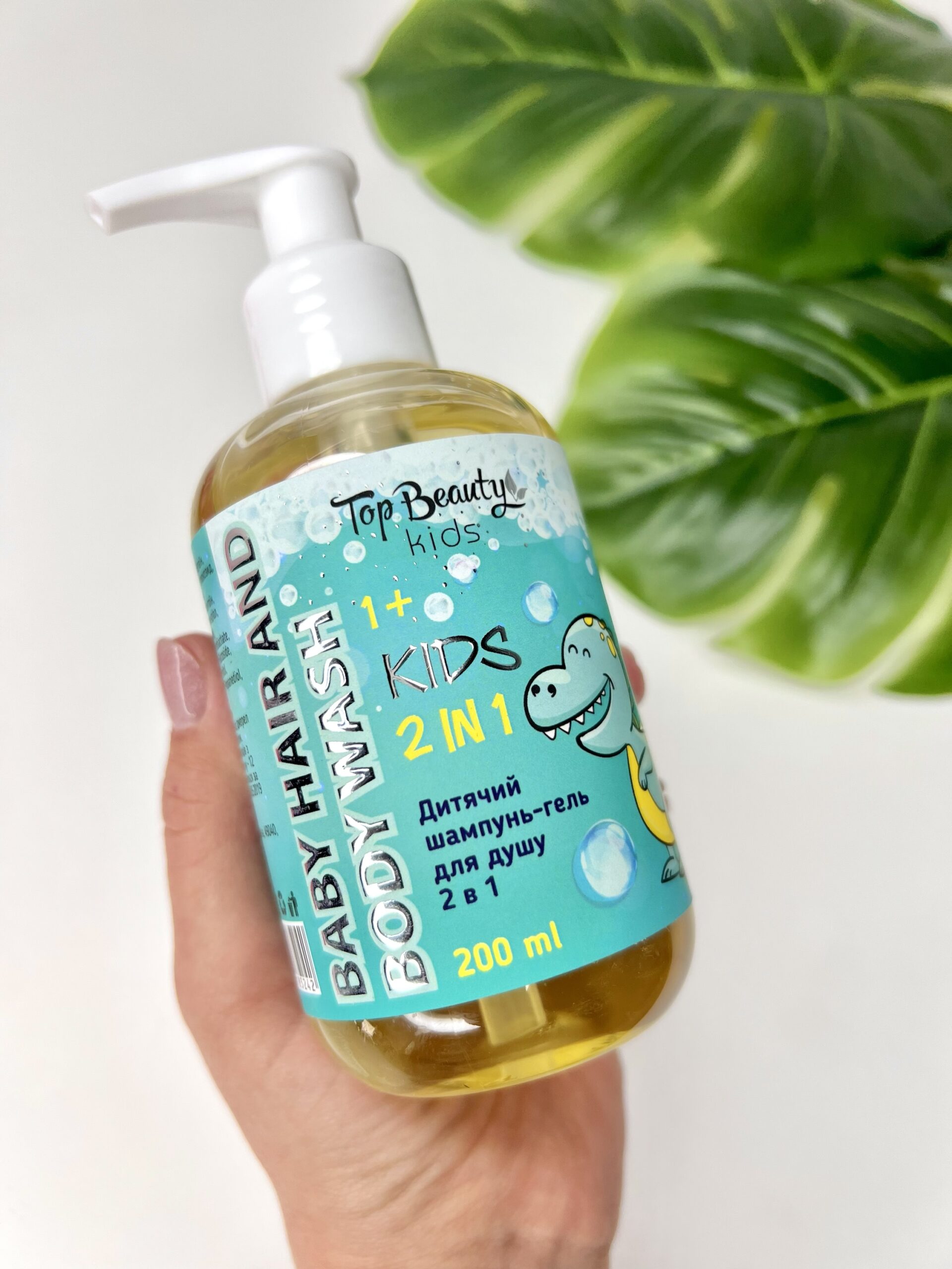 Шампунь для волосся та гель для душу 2в1. Для дітей віком від 1 року. Містить мʼякі мийні складові, які дбають про волосся та шкіру. Очищує, але не сушить і не подразнює дитячої шкіри.
